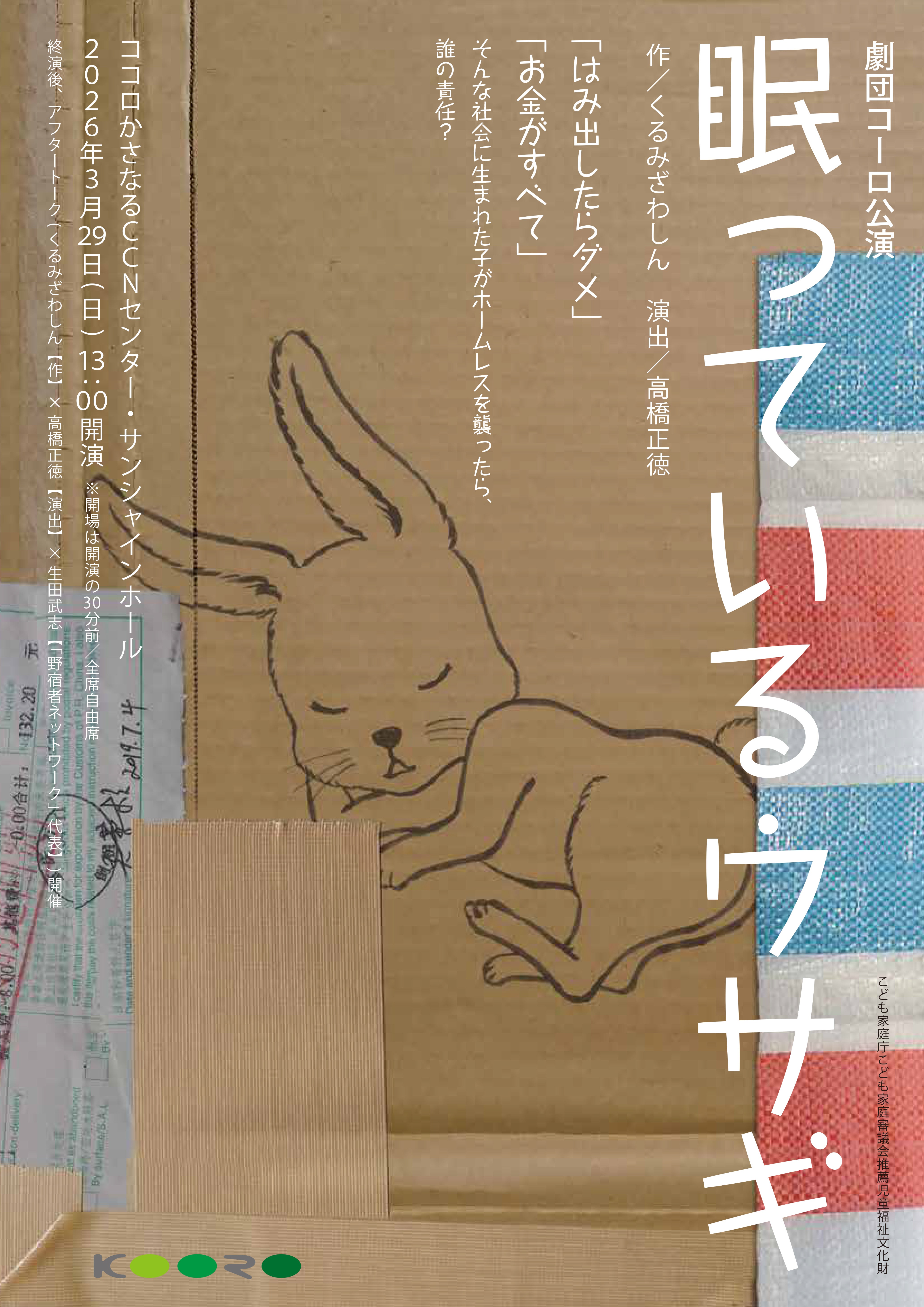 こんにちは。私たち一般社団法人劇団コーロは、2011年12月の設立以来、大阪を拠点に全国展開している劇団です。私たちは、高校生によるホームレス殺人事件を題材にした演劇『眠っているウサギ』( 作/くるみざわしん 演出/高橋正徳)を、2026年3月29日(日)に岐阜県瑞穂市で上演することとなりました(会場:ココロかさなるCCNセンター・サンシャインホール 開演:13時)。