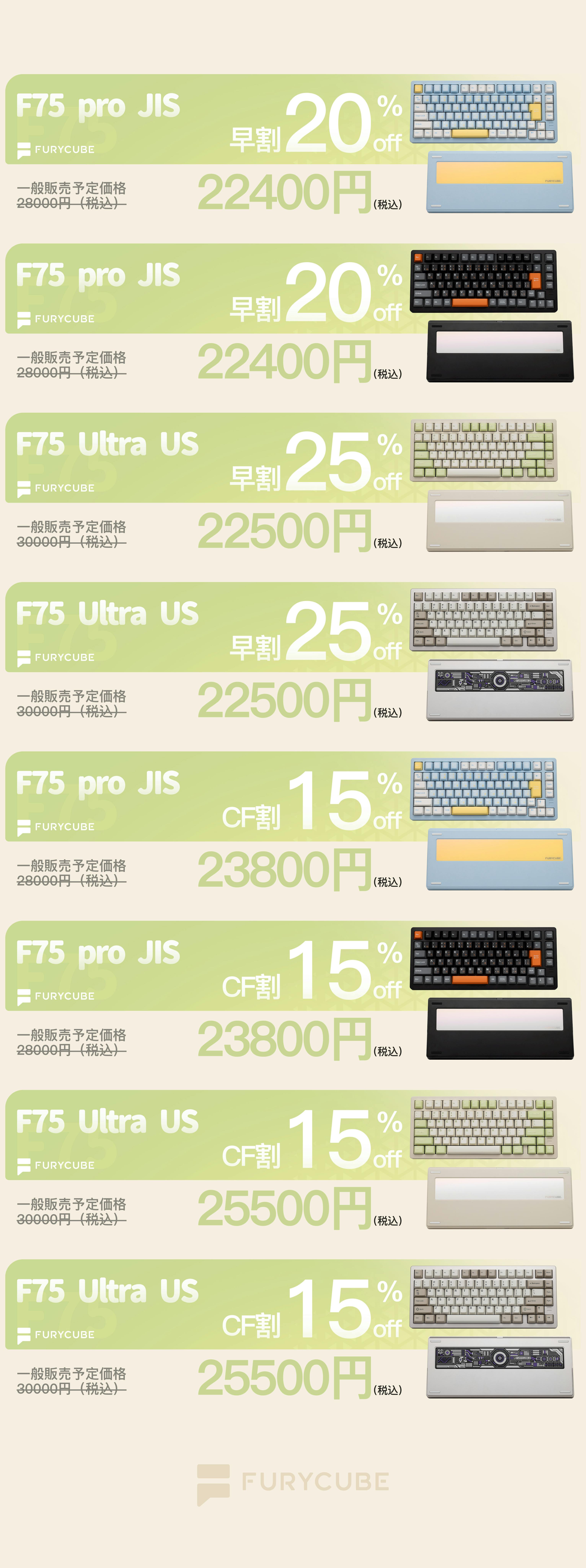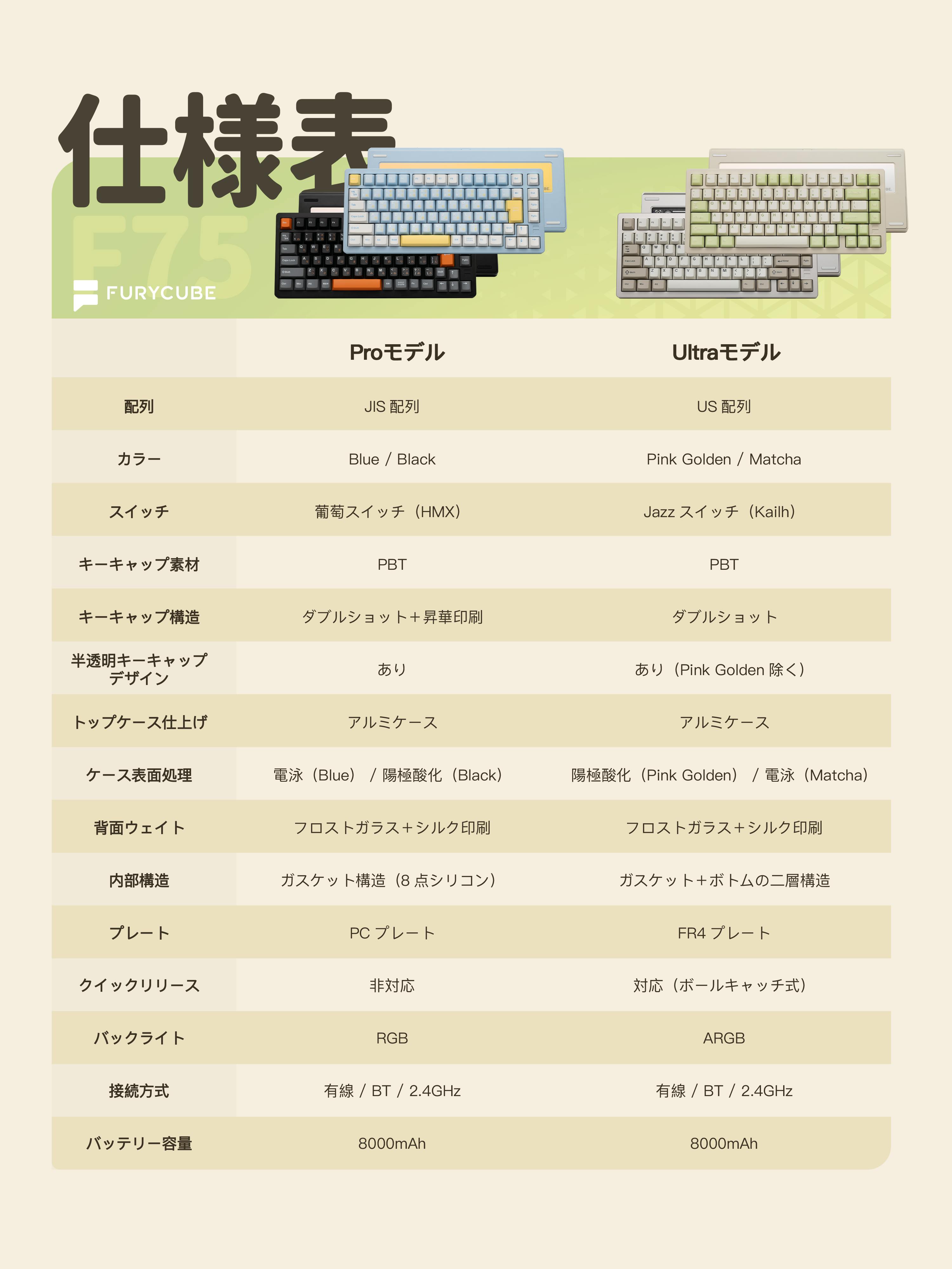 F75は、日本語入力に適したJIS配列を採用したProモデルと、構造変更やカスタマイズを楽しめるUS配列のUltraモデルの2種類を用意しています。
