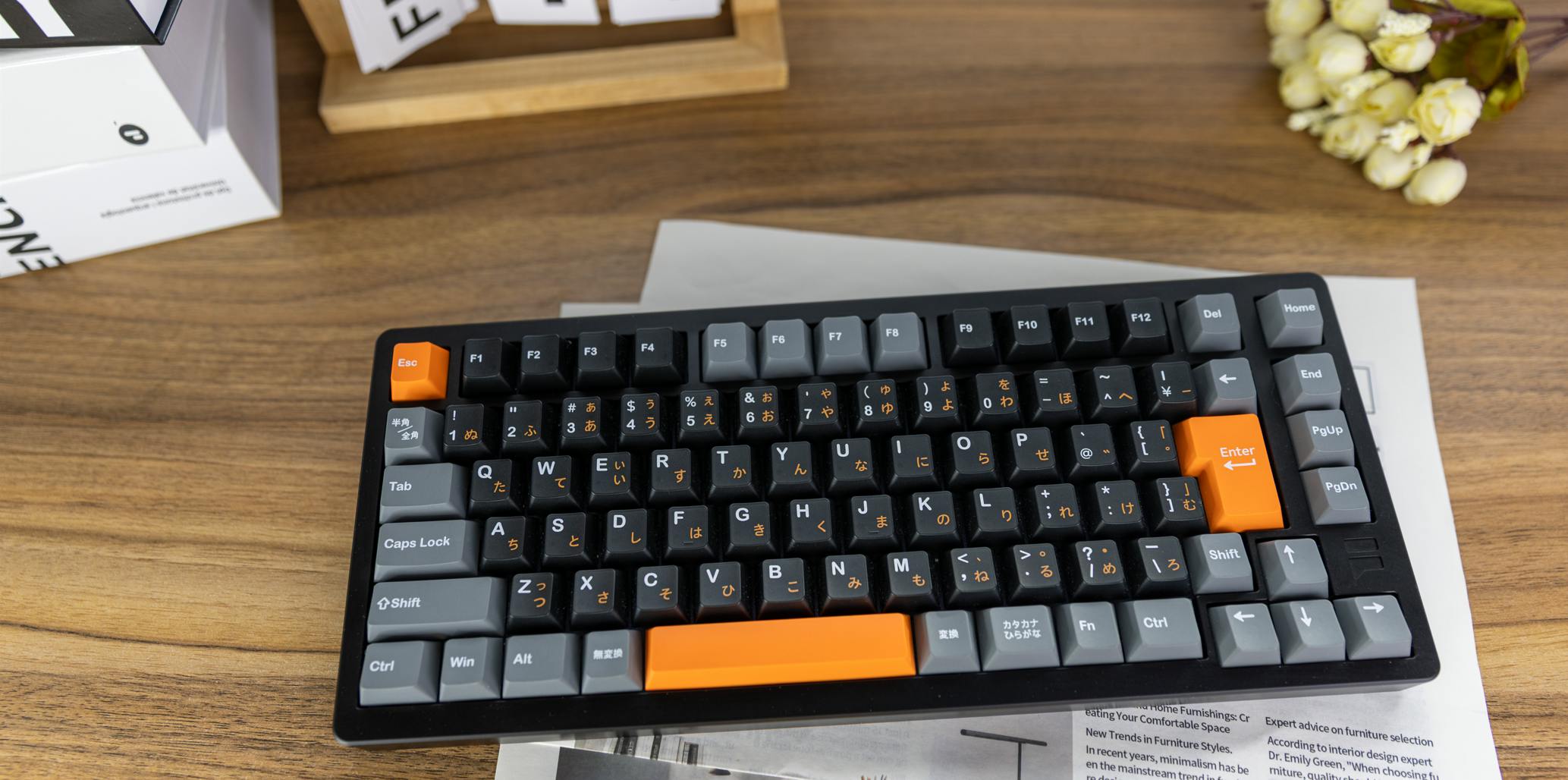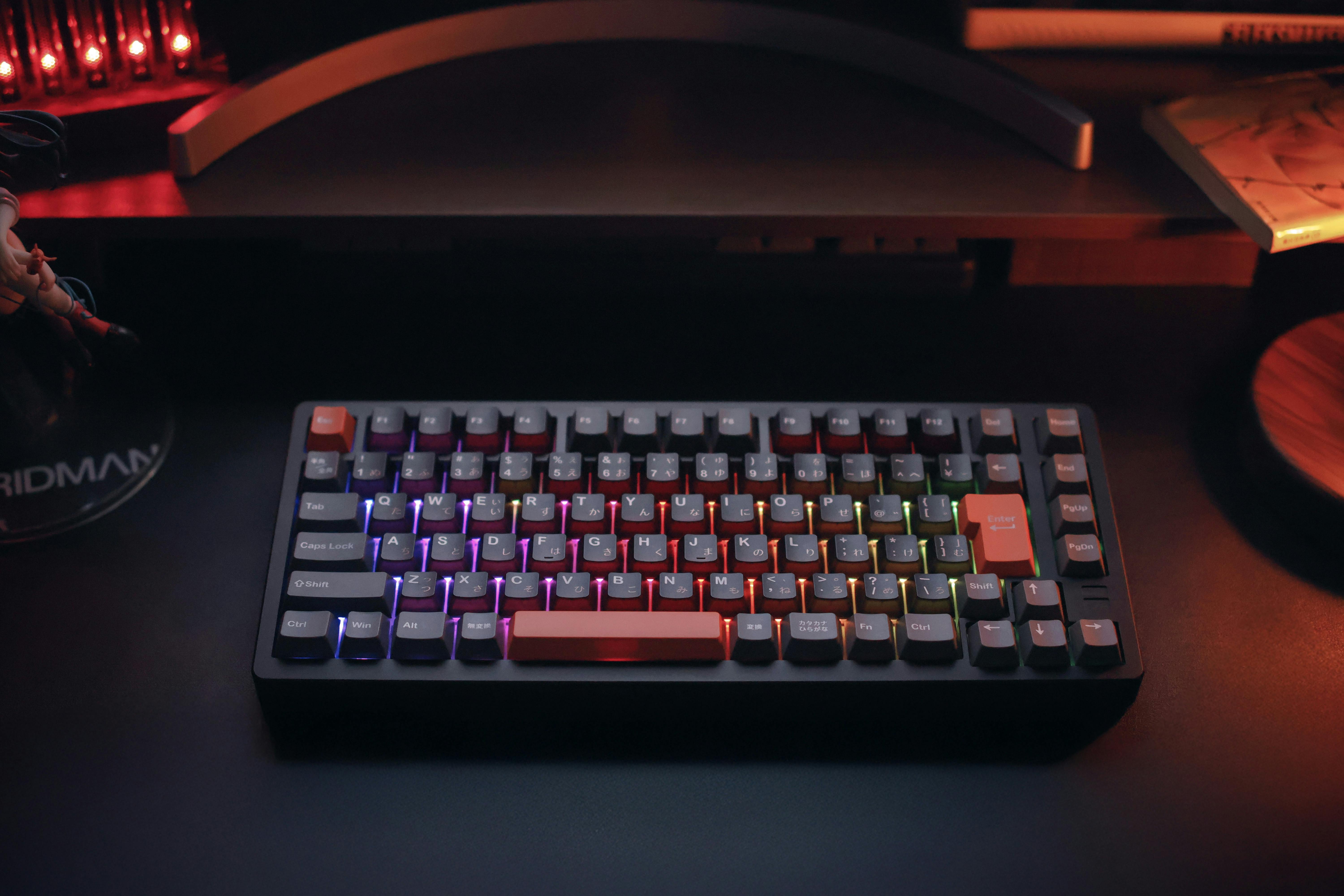 F75では、配列やモデルごとの用途に合わせたキーキャップを搭載しています。 JIS配列のProモデルには、PBTダブルショットと昇華印刷を組み合わせたキーキャップを使用し、文字の視認性と耐久性を追求。