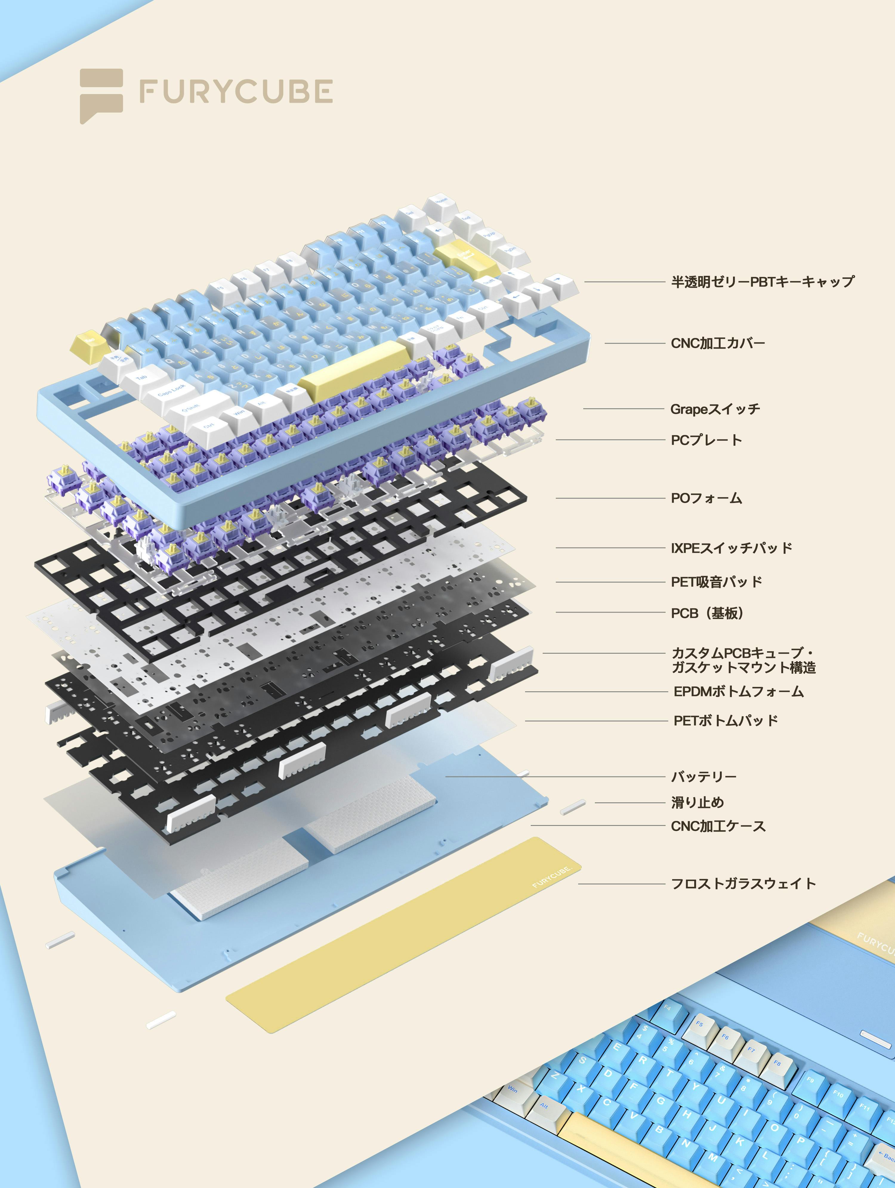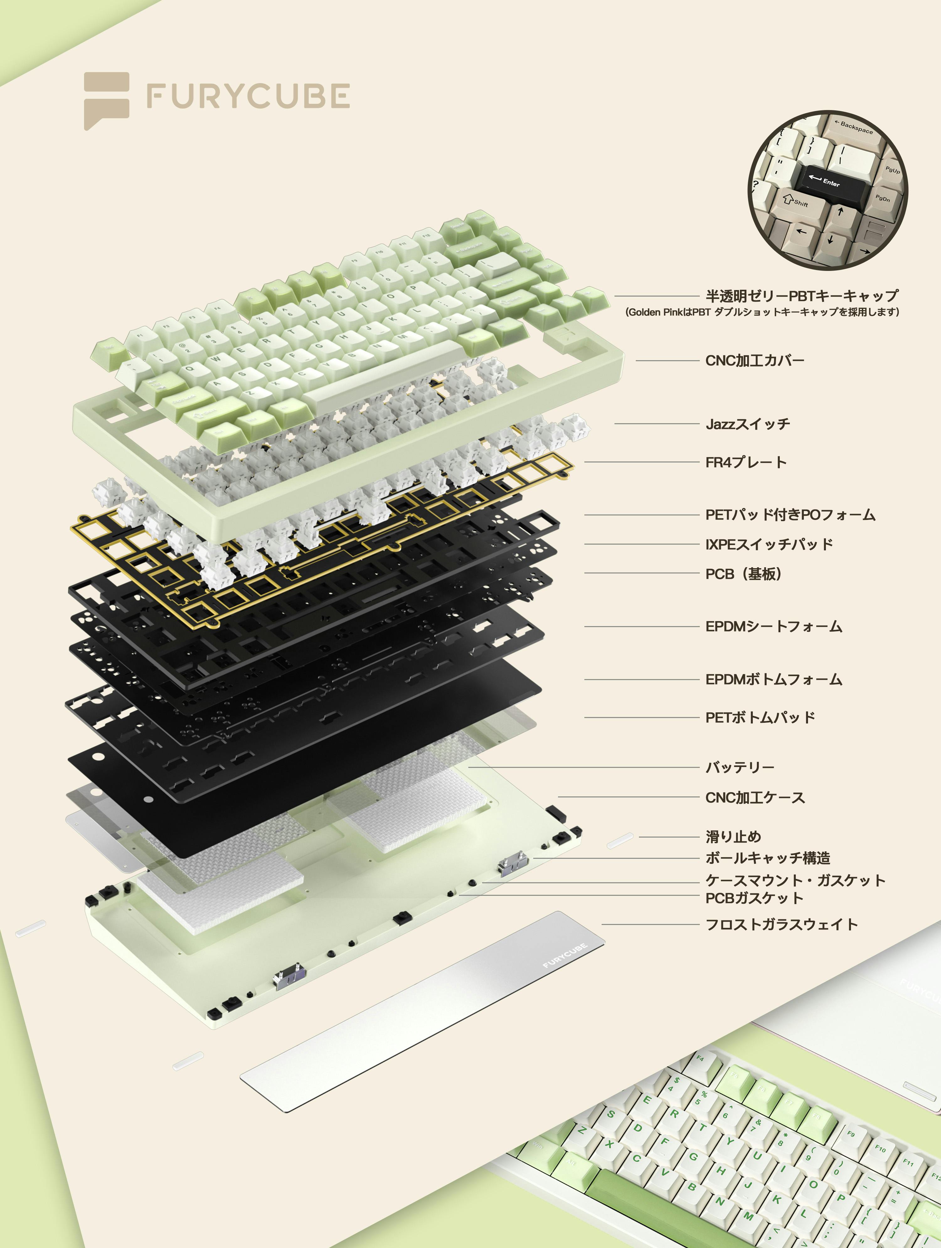 また、FURYCUBEはもともとガラス製品の製造を手がけてきた背景があり、背面プレートにガラスを採用するデザインには特に自信があります。実用性だけでなく、美しさを備えたキーボードとして、多くの方にお楽しみいただければ幸いです。