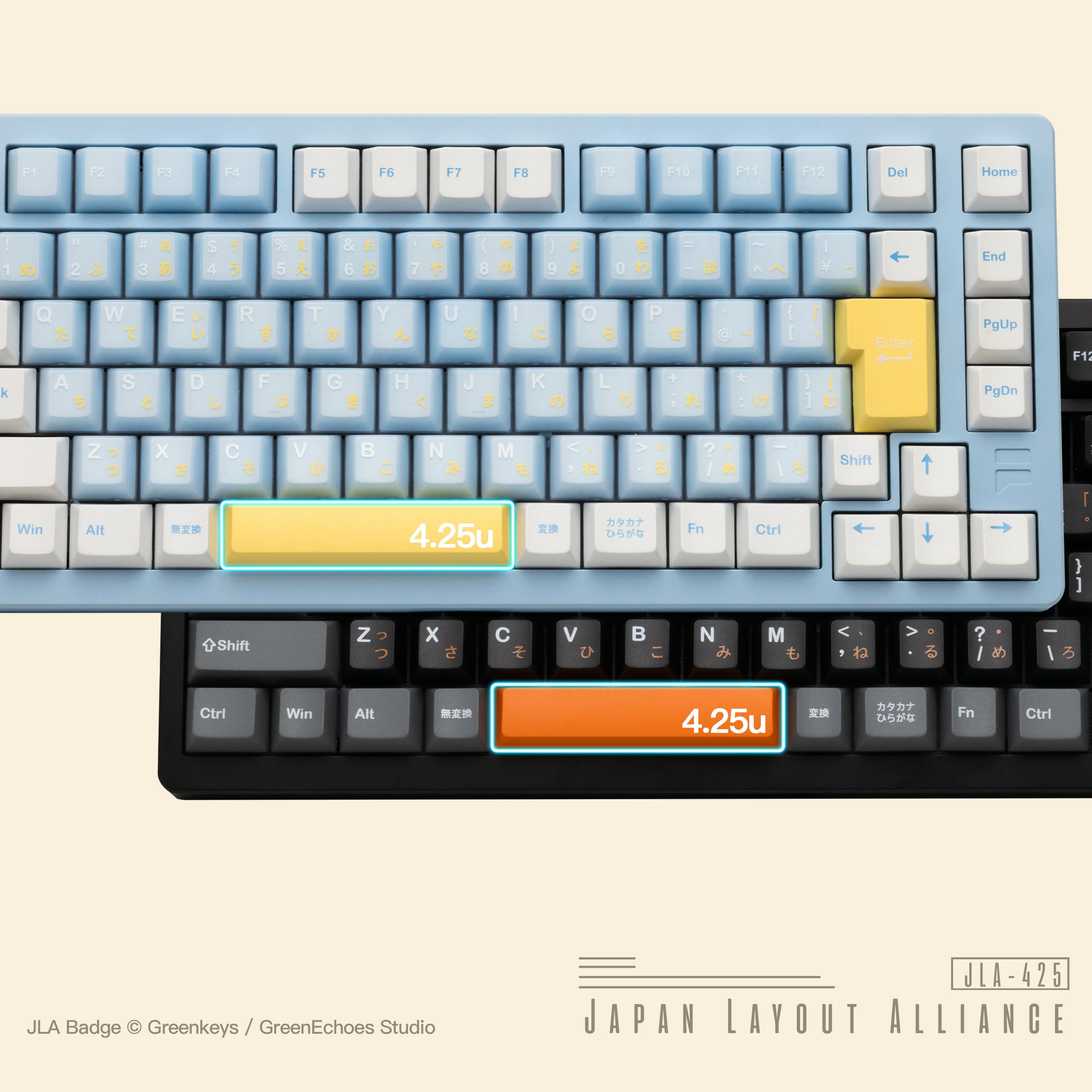 F75 Proモデルでは、JLA(Japan Layout Alliance)の考え方に準拠し、スペースバーを4.25uで設計しています。日本語配列キーボードにおけるスペースバー周辺の互換性を重視することで、現在流通しているキーキャップはもちろん、今後展開される日本語配列キーキャップとも組み合わせやすい構成を目指しました。
