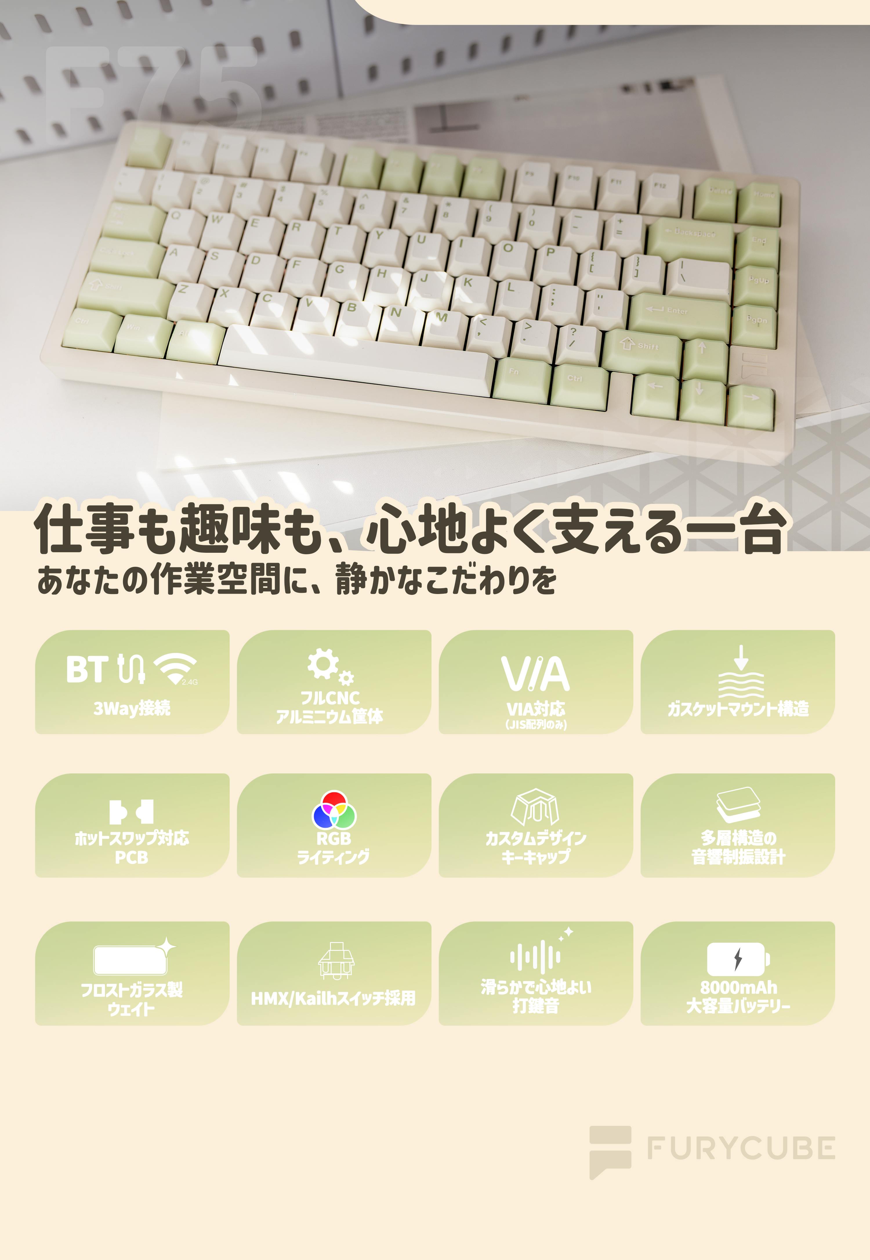 FURYCUBE F75は、仕事やゲームなど日常のさまざまなシーンで快適に使える、75%レイアウトを採用したメカニカルキーボードです。