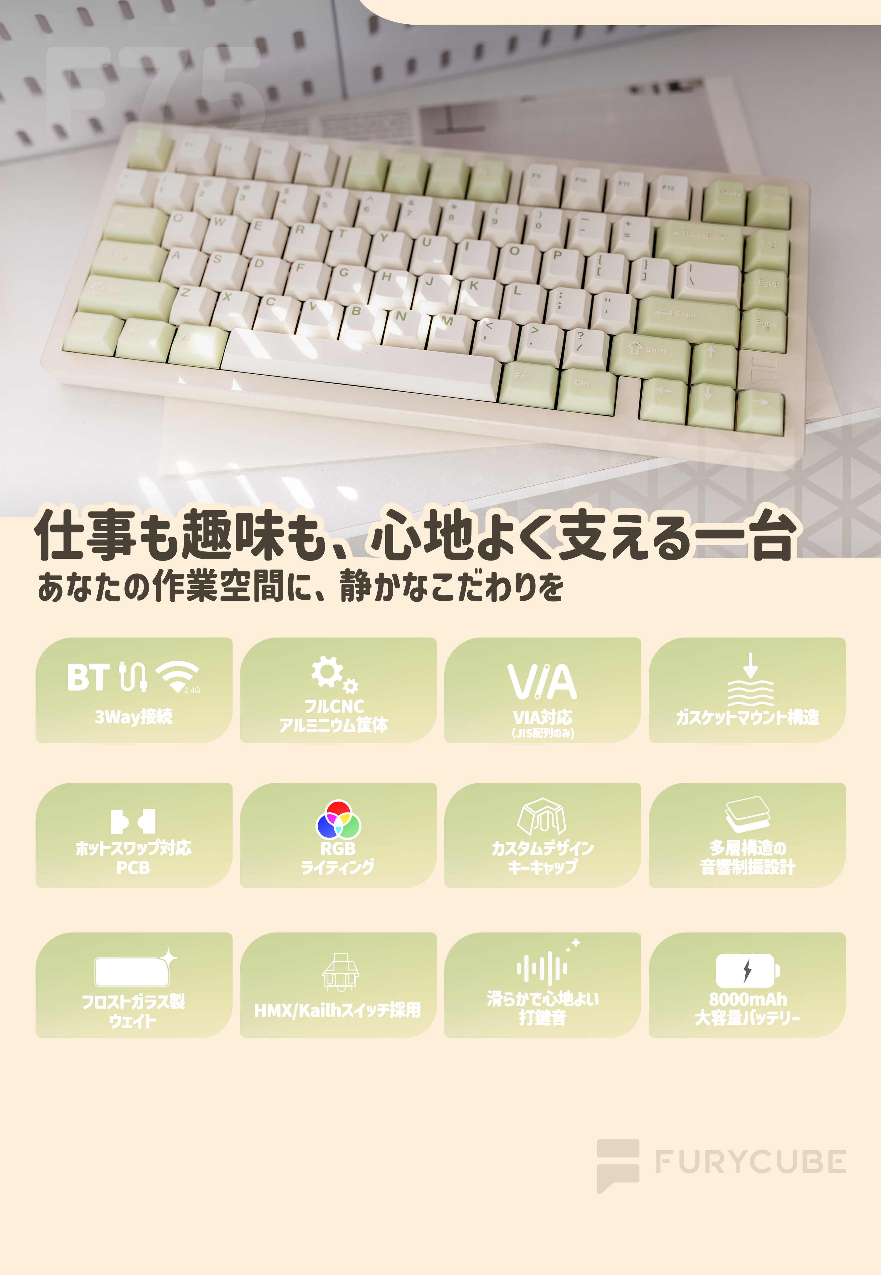 FURYCUBE F75は、仕事やゲームなど日常のさまざまなシーンで快適に使える、75%レイアウトを採用したメカニカルキーボードです。
