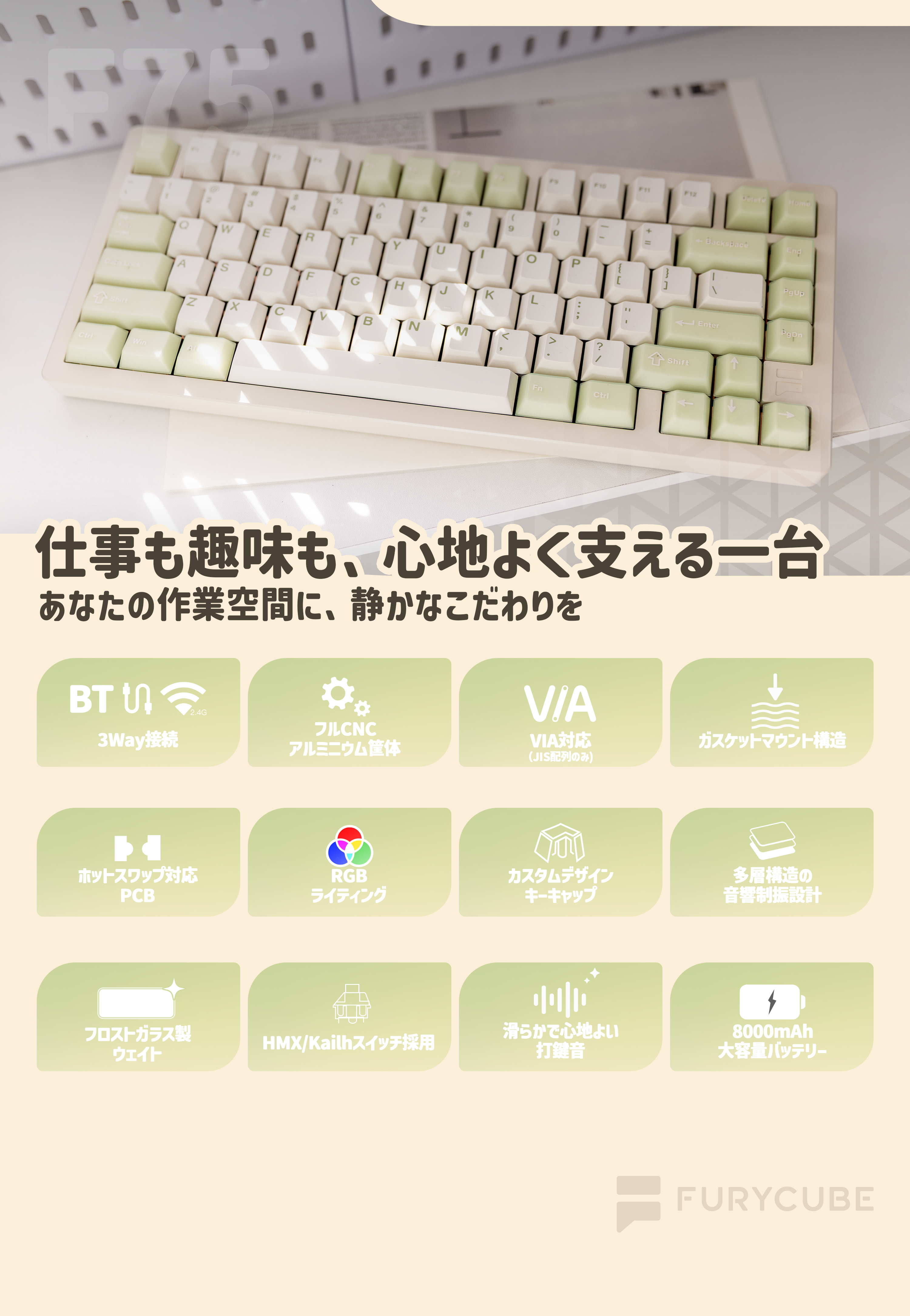 FURYCUBE F75は、仕事やゲームなど日常のさまざまなシーンで快適に使える、75%レイアウトを採用したメカニカルキーボードです。
