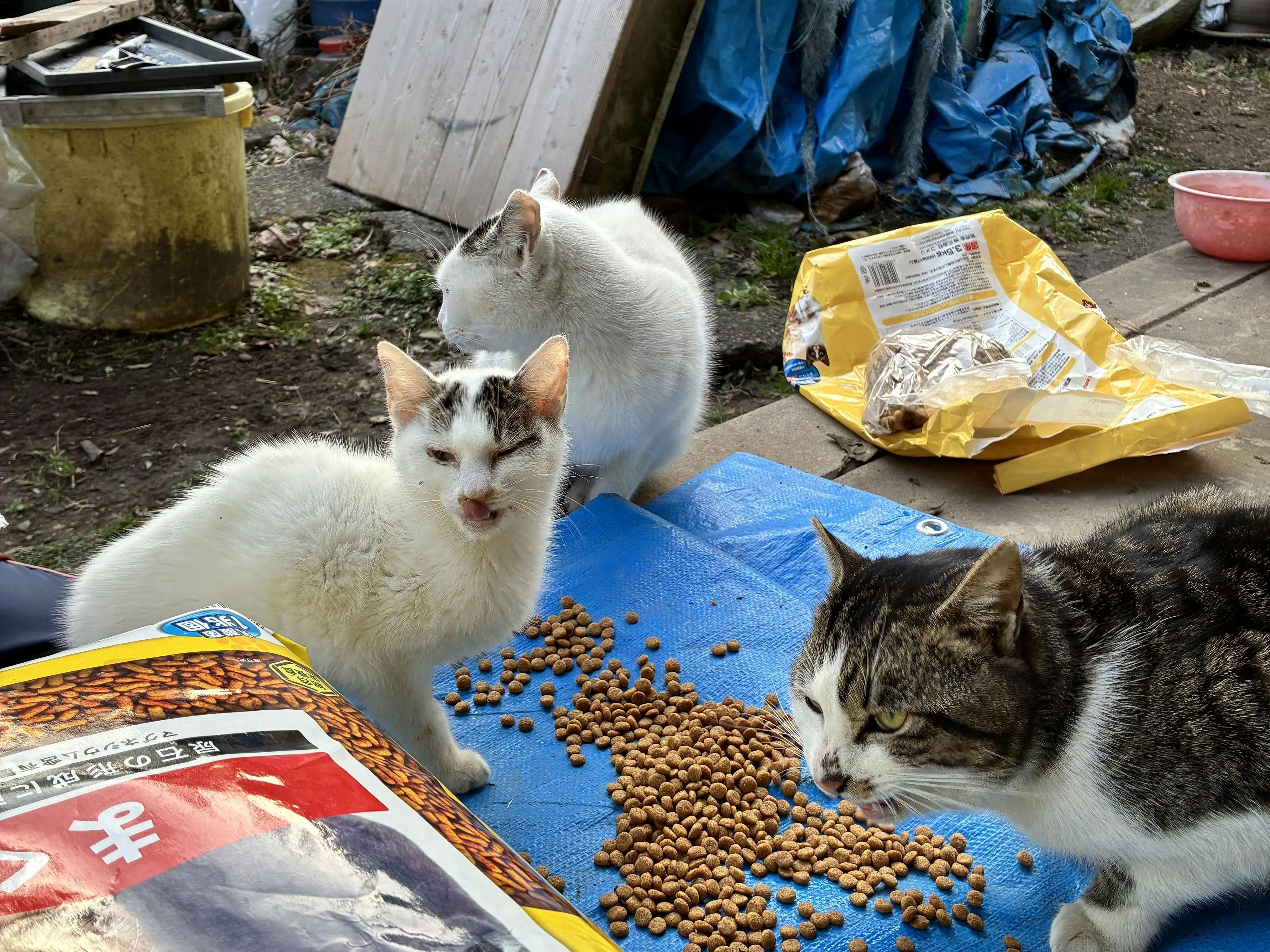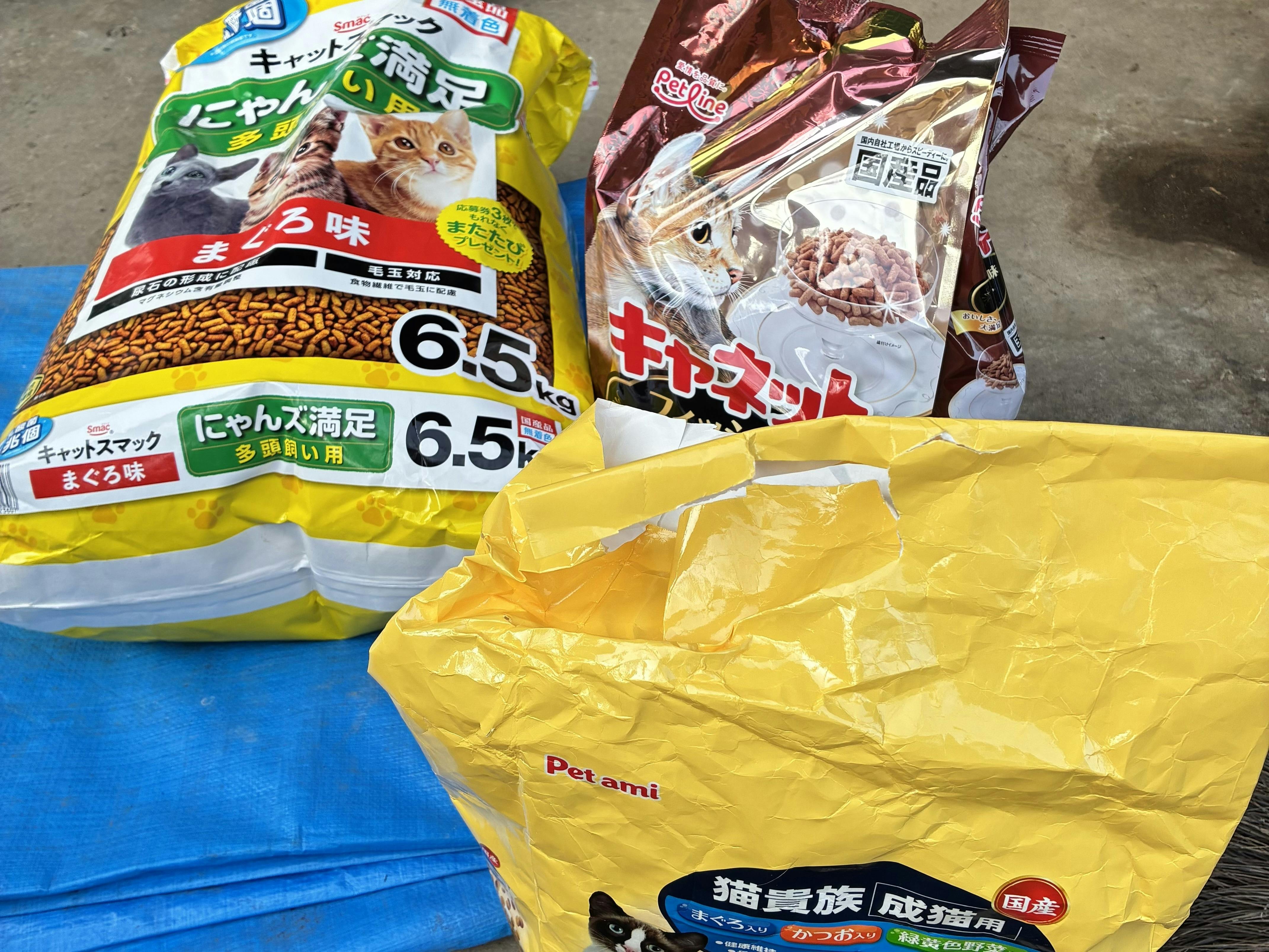 年金暮らしのため突発の出費があると、ねこのごはんがどうしても足りなくなってしまうそうで、フードを支援を時々行っています。支援でいただいた物資も届けました。ありがとうございます