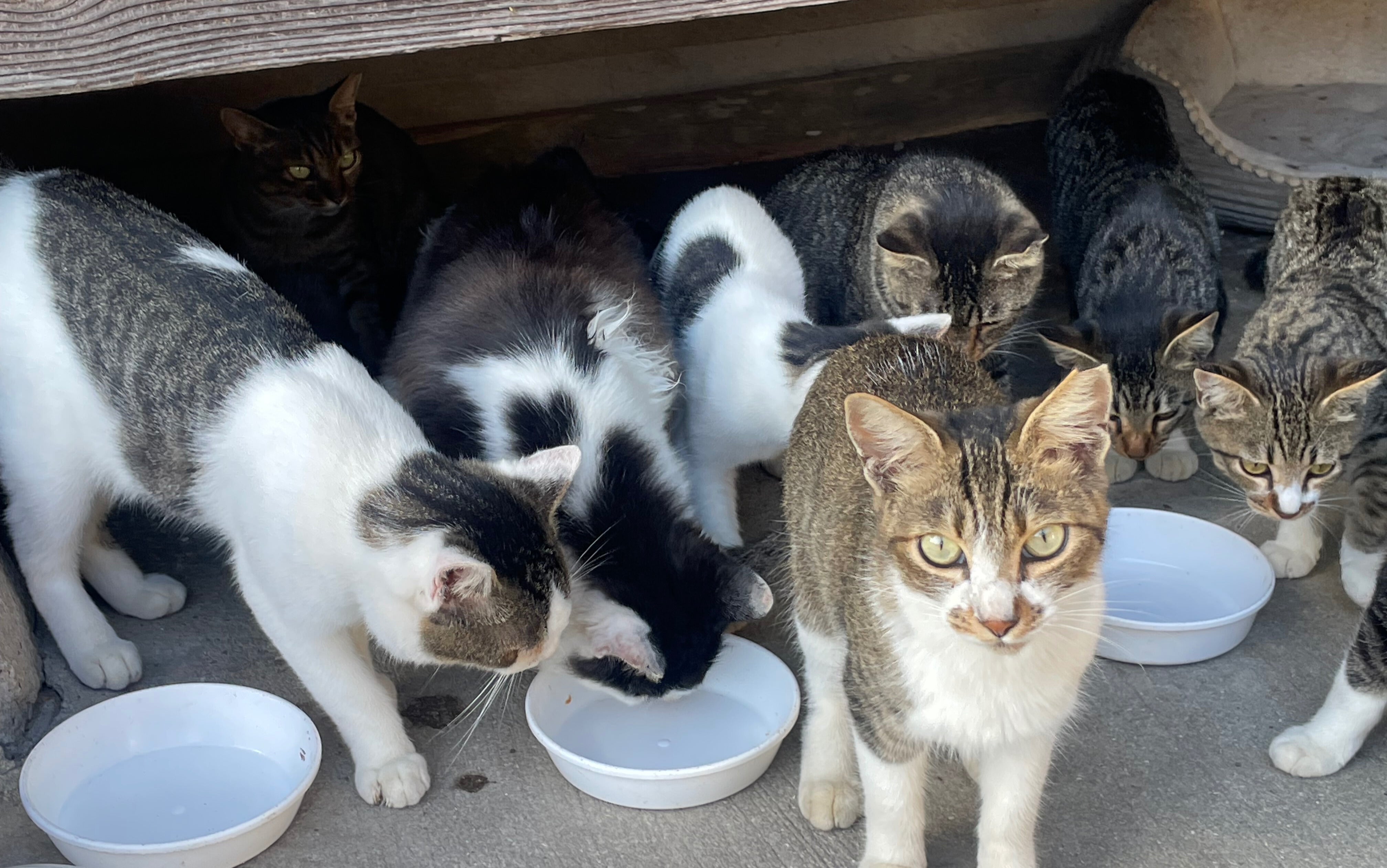 わからない、知らないから何もしなかった、をなくして、自分たちの地域の猫たちは自分たちで地域ねこにして見守っていく。捕獲機の貸し出しを行い、捕獲の方法、助成金の申請の方法、手術ができる病院の情報提供などを行い、手術後の地域ねこ活動の方法を説明して、猫問題に取り組めるように支援をします。ごはん待ちの猫さんたち。③多頭飼育崩壊のサポート