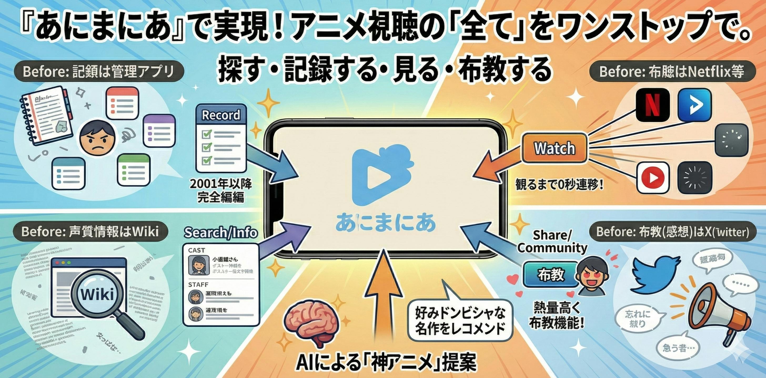 私たちが目指すのは、「探す・記録する・見る・布教する」をワンストップで完結させる、アニメ視聴管理の決定版アプリです。