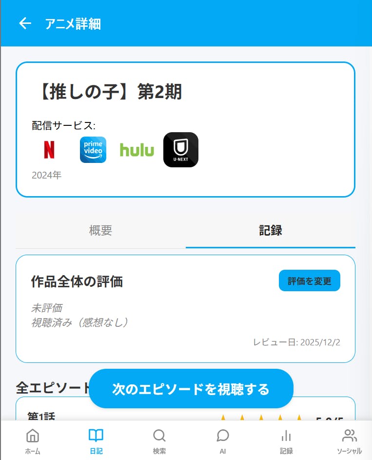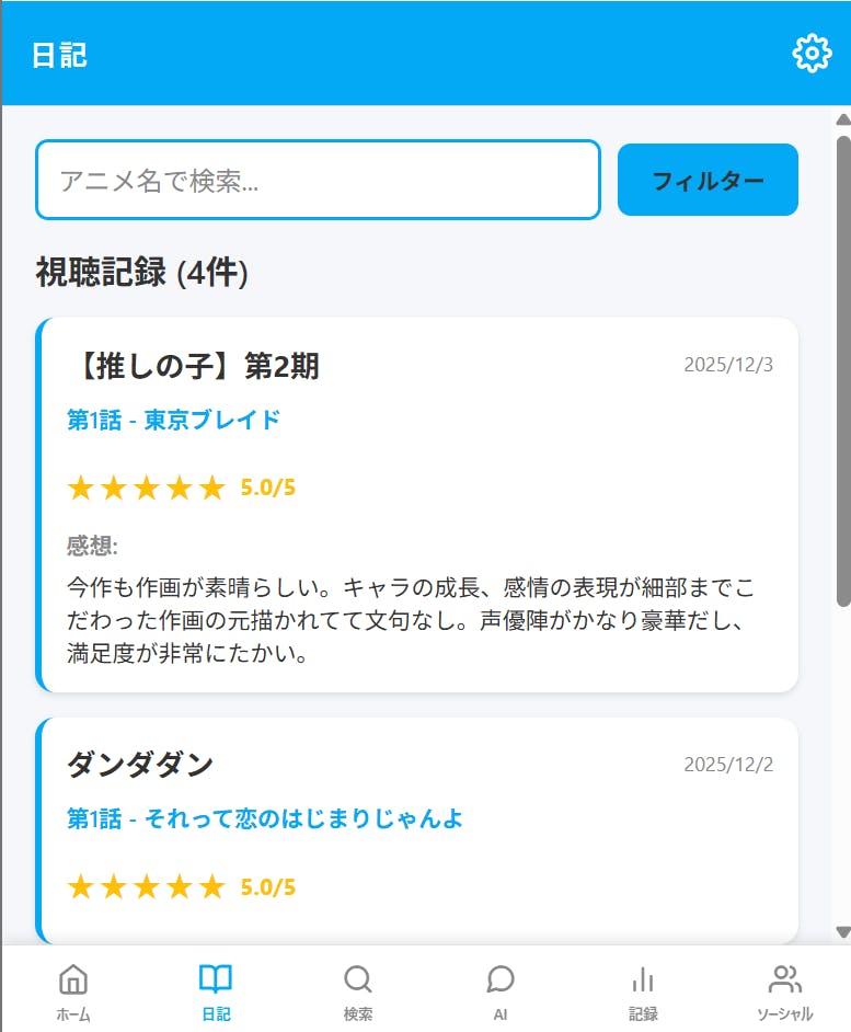 既存の環境では、「記録は管理アプリ」「視聴はNetflix」「声優情報はWiki」「布教(感想)はX(Twitter)」といったように、ツールが分散してしまっています。『あにまにあ』は、これらを一つのアプリに統合し、以下の機能を実現します(2026年1月リリース版)。