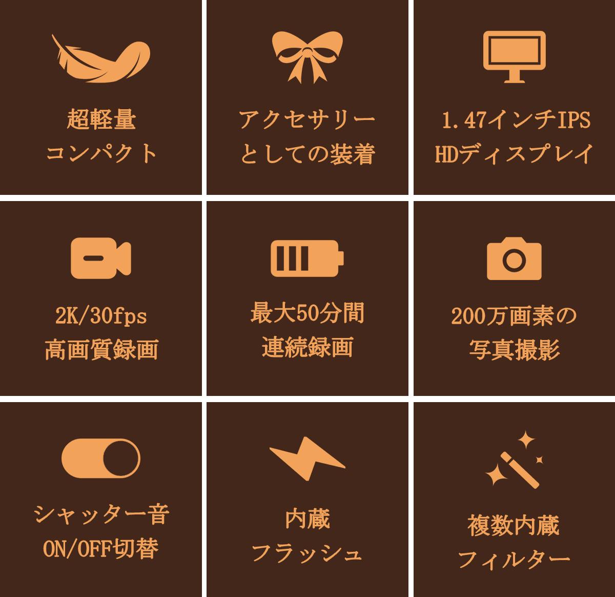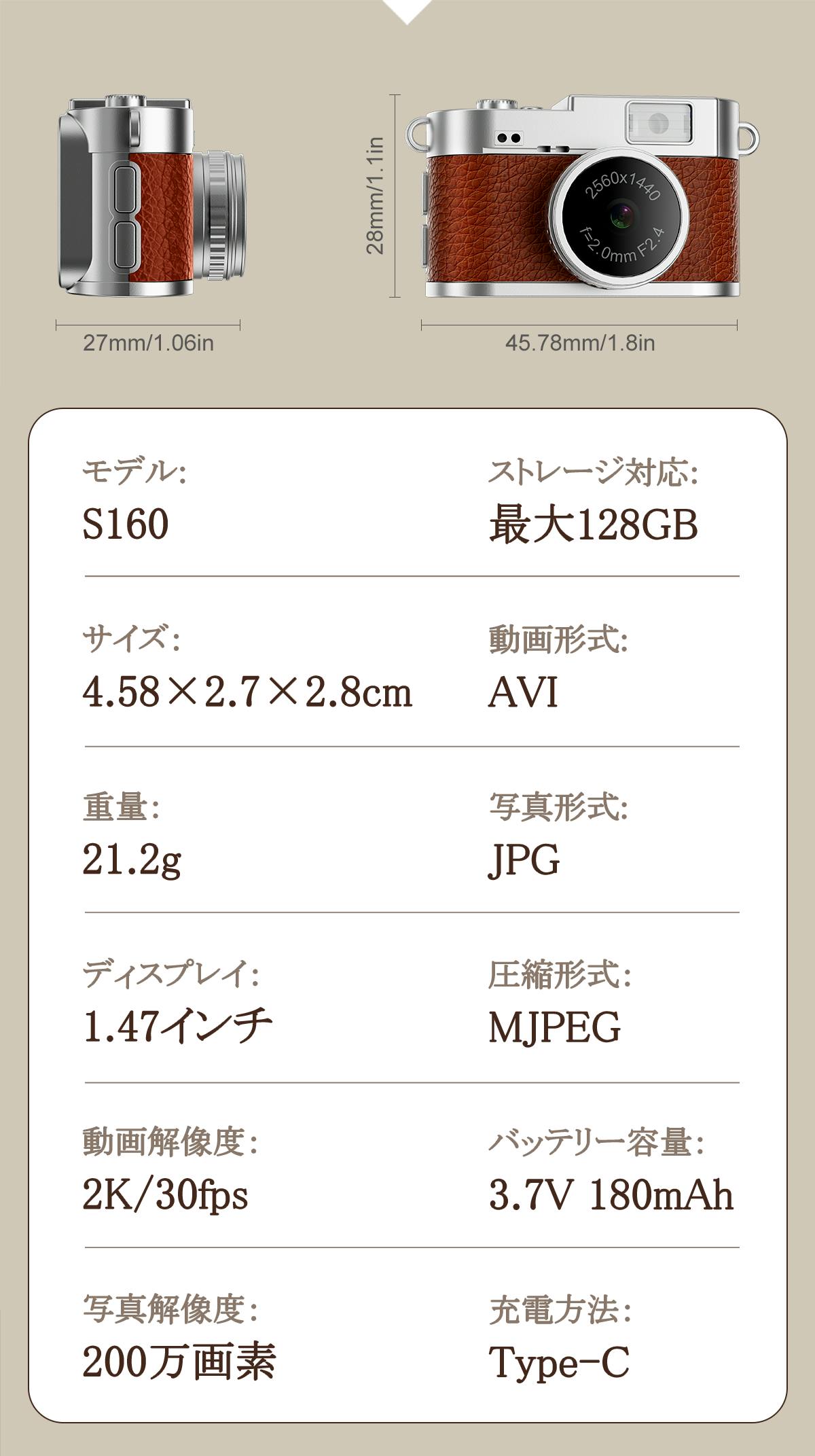 180mAhのリチウム電池を内蔵しており、フル充電で最大約50分間の連続録画や120分間の連続写真撮影が可能。子どもの運動会や長めのイベントでも、バッテリー切れを気にせず、本格的な写真と動画を撮影し続けられます。
