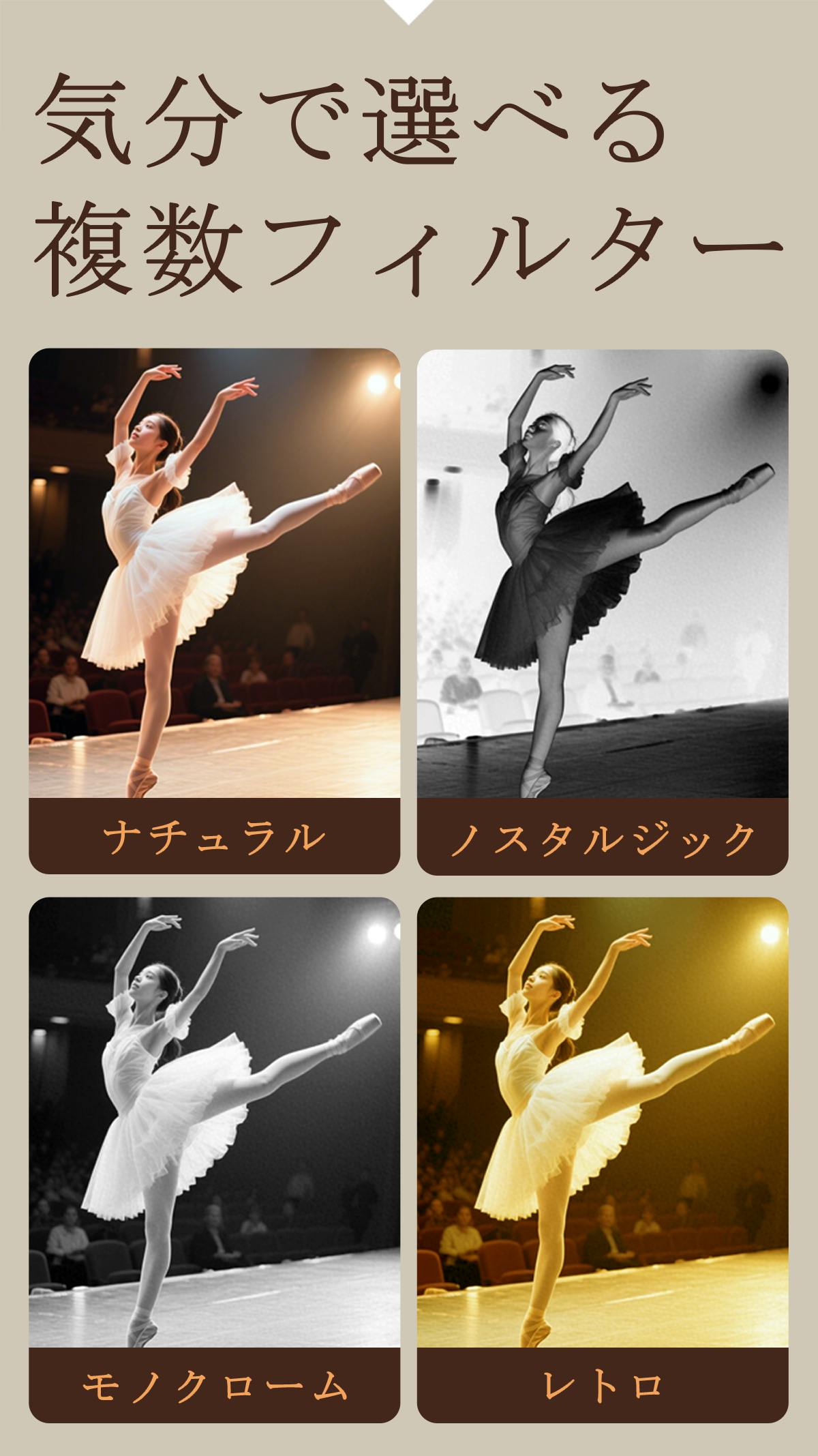 レトロなモノクロームからビビッドなカラーまで、多彩な内蔵フィルターで創作意欲を刺激します。その時の気分や被写体に合わせて、世界に一つのオリジナルショットを。