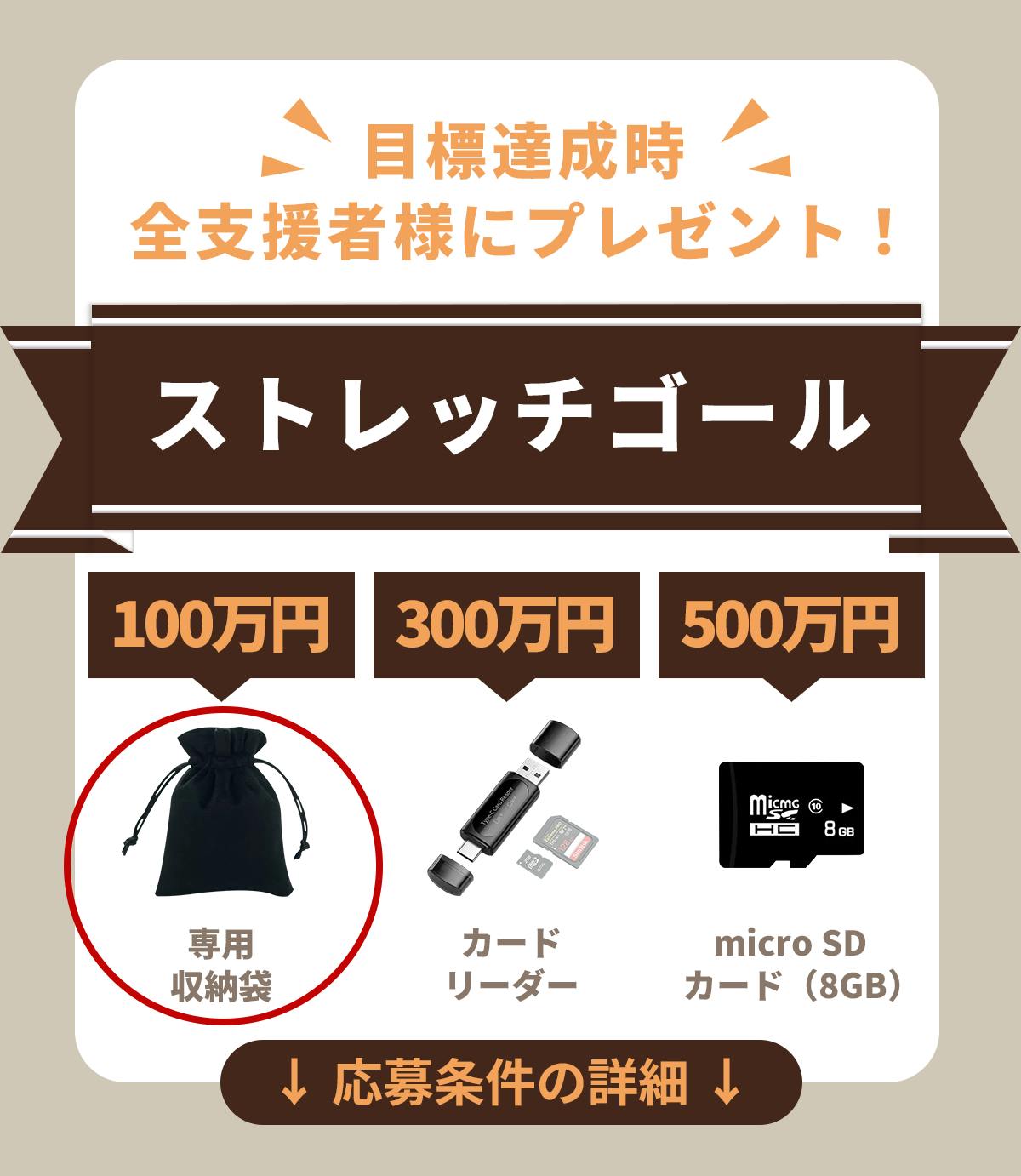 ・第三弾:500万円達成時、応募条件を満たした全支援者様に 「8GB micro SDカード」 をプレゼント!