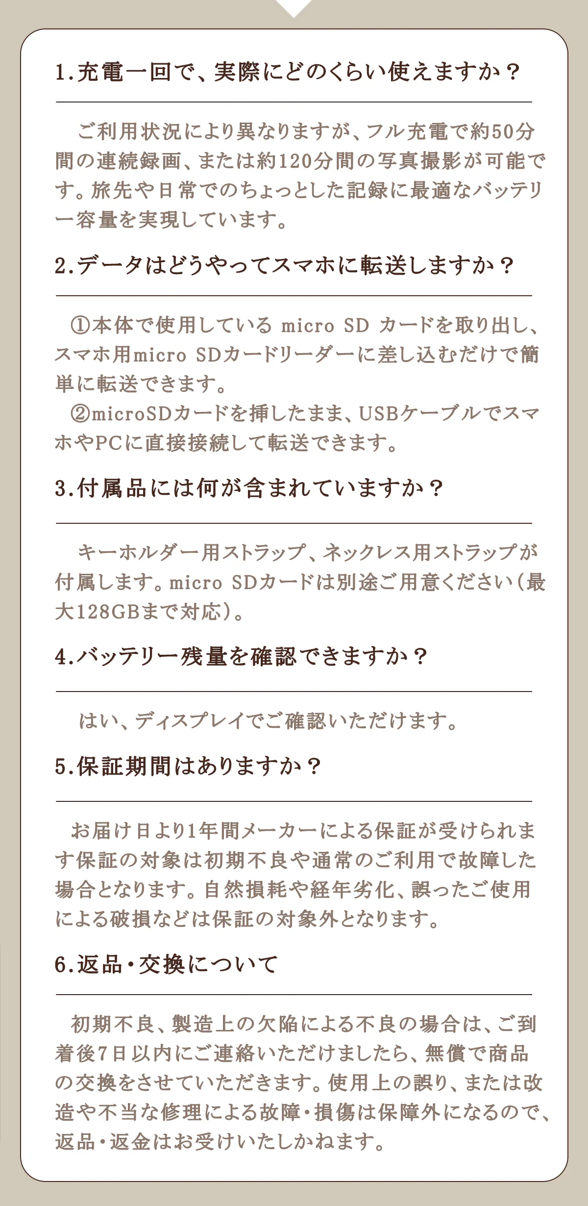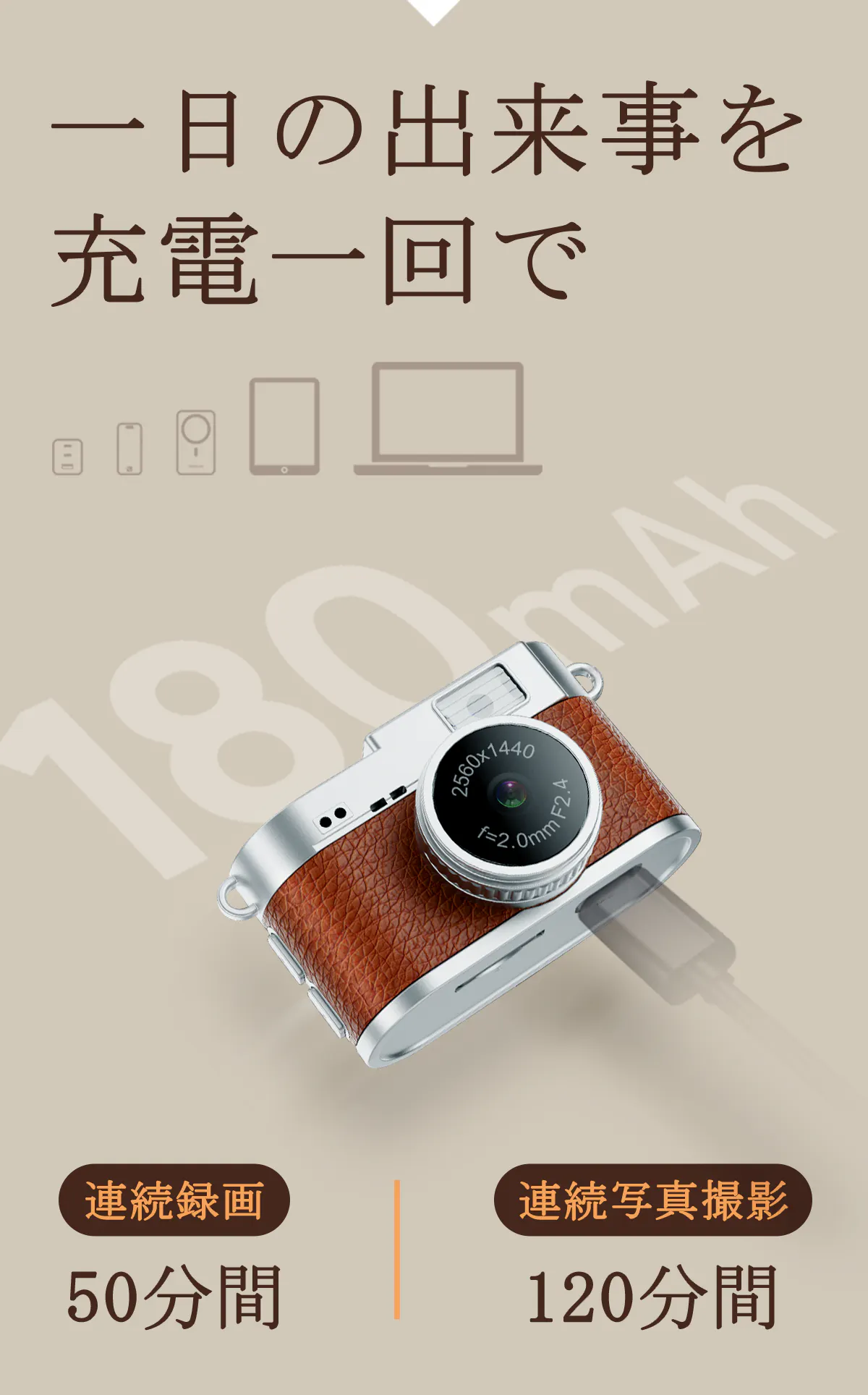 180mAhのリチウム電池を内蔵しており、フル充電で最大約50分間の連続録画や120分間の連続写真撮影が可能。子どもの運動会や長めのイベントでも、バッテリー切れを気にせず、本格的な写真と動画を撮影し続けられます。