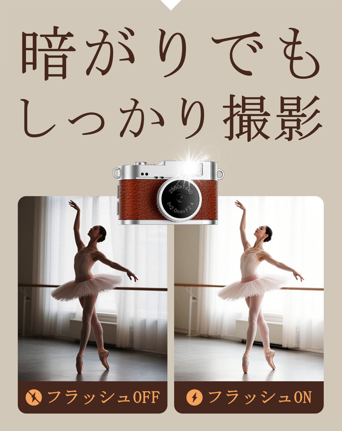 暗い場所や夜景、室内での撮影も内蔵フラッシュが被写体を明るく照らします。光量不足で写真が暗くなることを防ぎ、どんなシーンでもくっきりと写します。