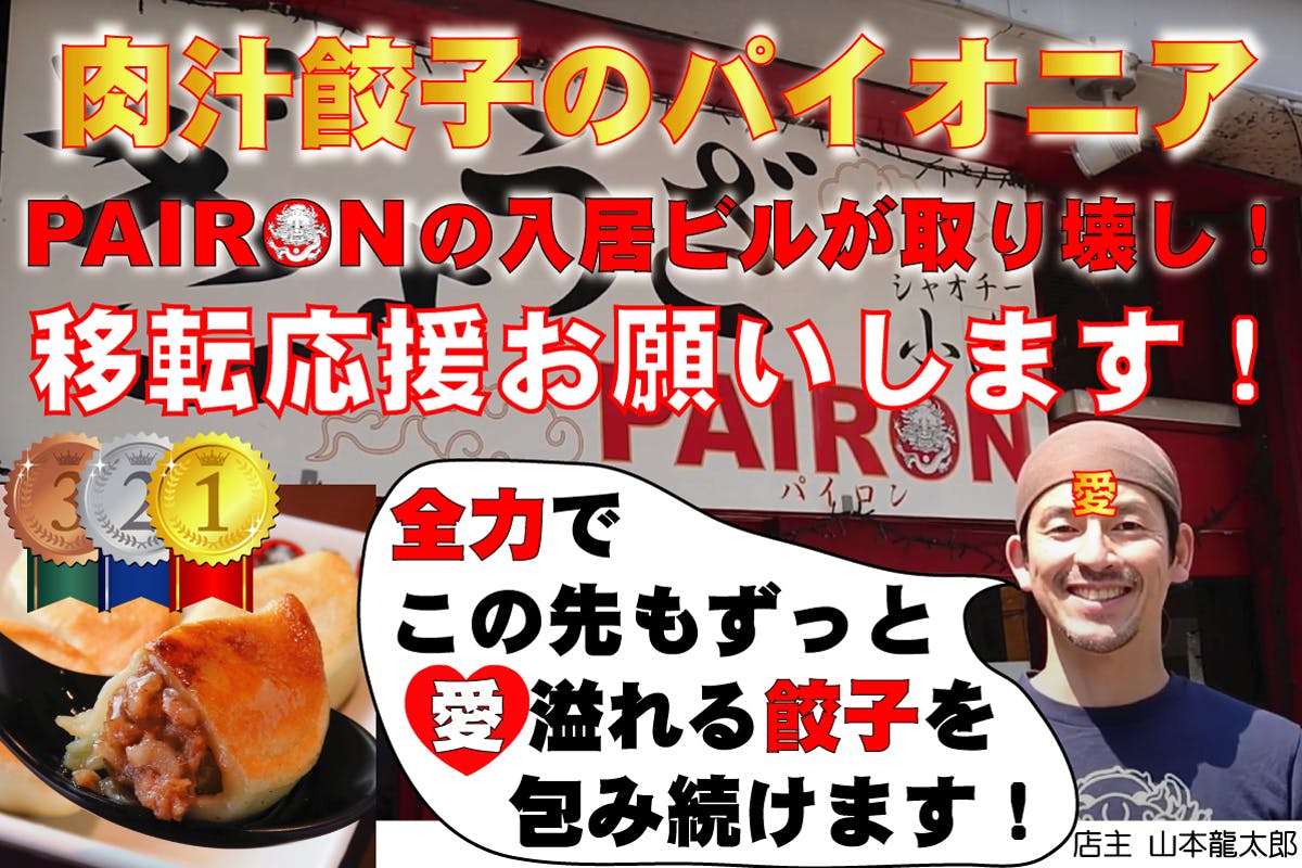 私の青春時代、全力を尽くしたPAIRONの閉店は非常に残念で、悲しいものがあります。しかし、私自身が食べたくて作った肉汁たっぷりの餃子を続けたい。唯一無二のオンリーワンの餃子をもっともっと皆さんに食べて頂きたい。そんな思いで、移転を決意しました。