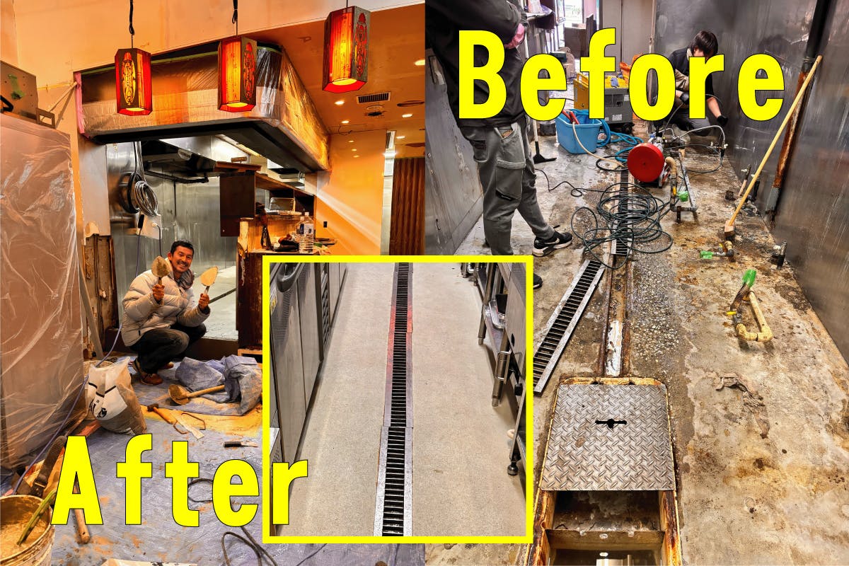 中古物件の一番の敵である汚れは、直接お客様への安心や信頼に繋がる事なので、第一優先として徹底的に工事致しました!不意を突かれる問題も数多く発生し、予想以上に大変でしたが、職人さんたちのプロの技でとってもキレイな店内に生まれ変わりました!