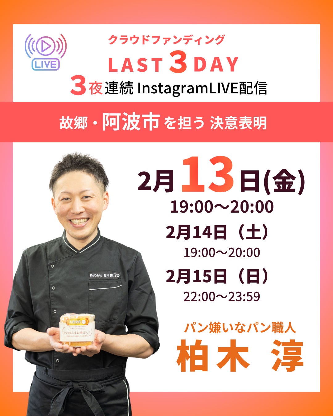 2026/02/13 18:09いつも応援本当にありがとうございます!現在――支援総額 666,360円達成率 44%ここまで来ました!一人ひとりのご支援が、本当に力になっています!心から感謝しています。■ インスタライブやってますここ数日、自分の言葉で想いを伝えています。そのまんまお米ぱんのこと。阿波のこと。なぜ今、挑戦しているのか。そして今日から最終日まで、毎日19:00頃からインスタライブやります。(最終日だけ22:00〜終了まで)5分だけでも、のぞいてもらえたら嬉しいです。■ 勝手に阿波代表僕はずっと、「勝手に阿波代表」のつもりで立っています!阿波のお米。阿波の作り手。まだ外に届いていない力。このクラファンは、ただの商品販売じゃない。阿波に光を当てる挑戦です!目標150万円までは、まだ道の途中。でも、止まりません。絶対に諦めません!ここまで支えてくれた皆さんの想いを背負って、最後まで本気で走ります!もし少しでも「応援したい」と思ってもらえたら。僕をに賭てください。皆さんを背負って戦います!!!勝手に阿波代表、最後までいきます。パン嫌いのパン職人柏木 淳 もっと見る