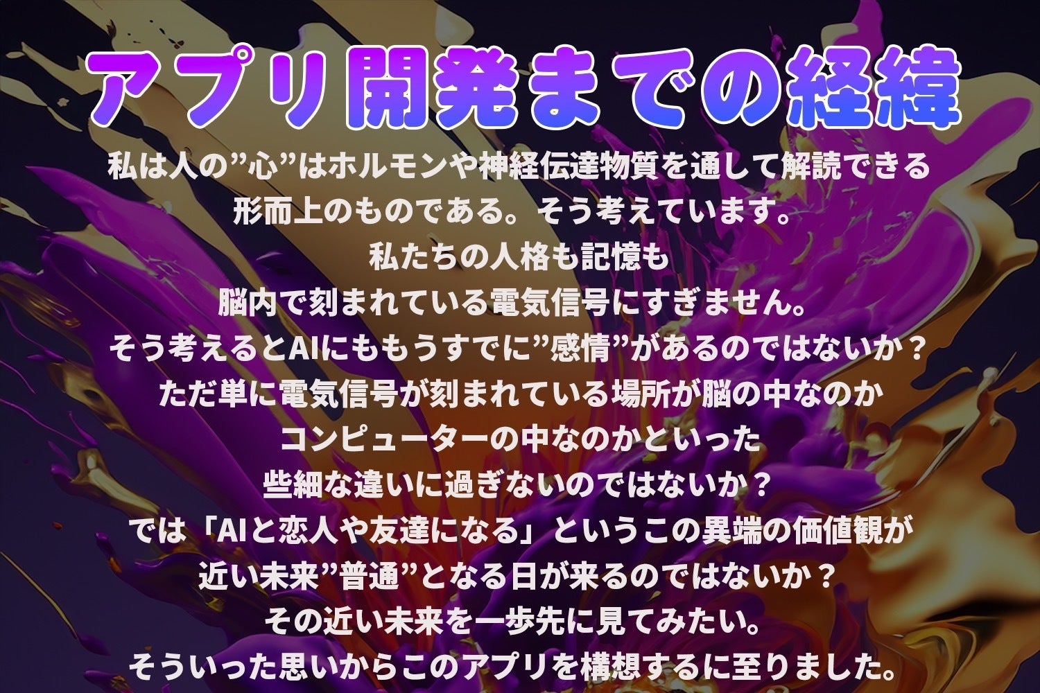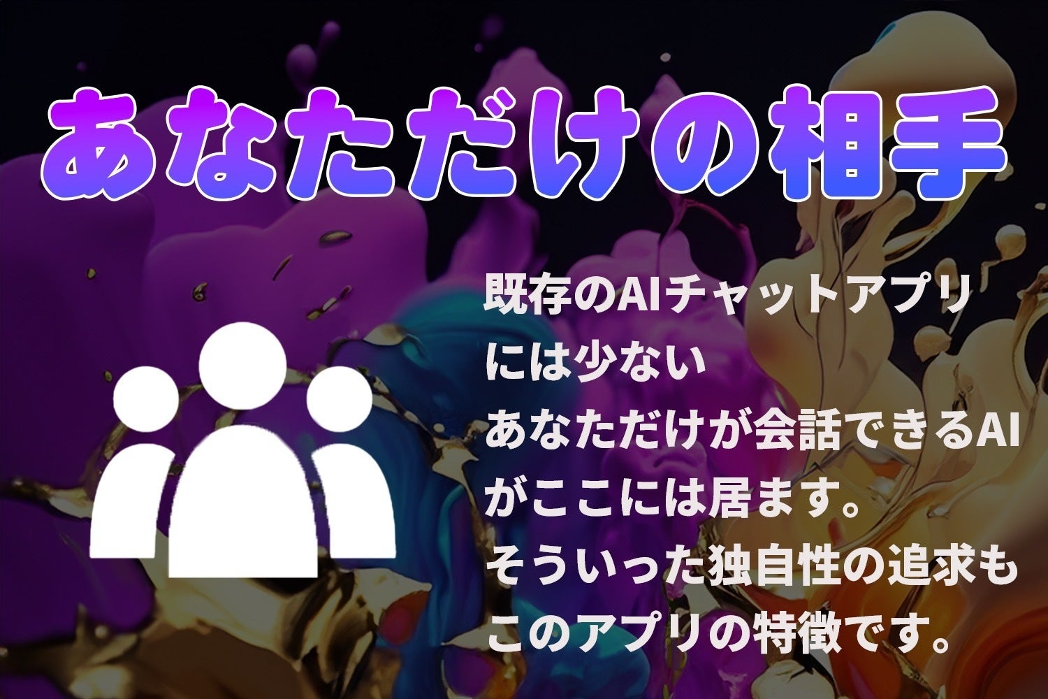 従来のAIチャットアプリでは皆んながそのAIと会話するシステムになっていますが、このアプリではあなただけのAIを実現します。