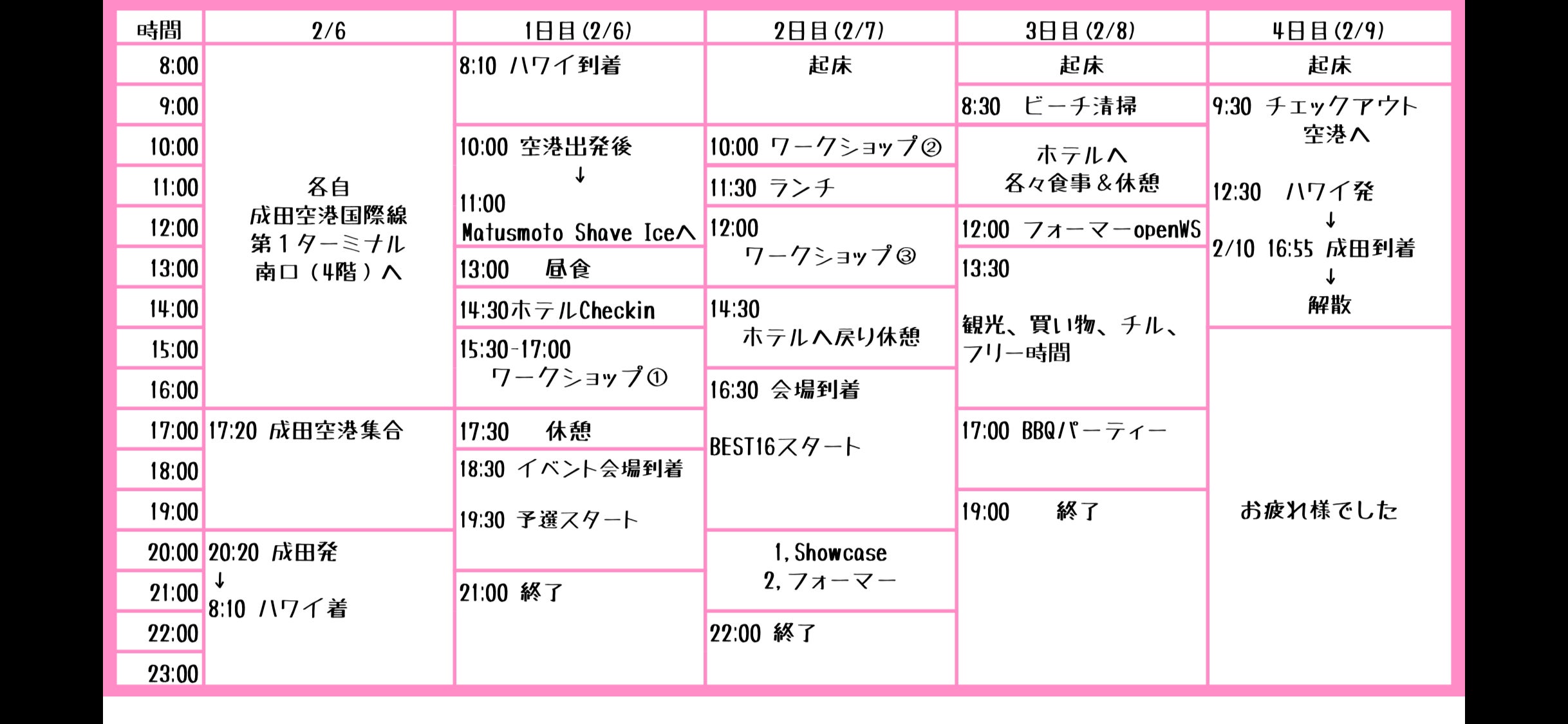 本日、夜の便でハワイへ行ってきます!さー無事全員ハワイまで辿り着けるのでしょうか?乞うご期待!ハワイでのスケジュールはこんな感じです!なかなかタイトなスケジュールですが皆が素晴らしい経験ができるようサポートしてまいります!また報告します!!