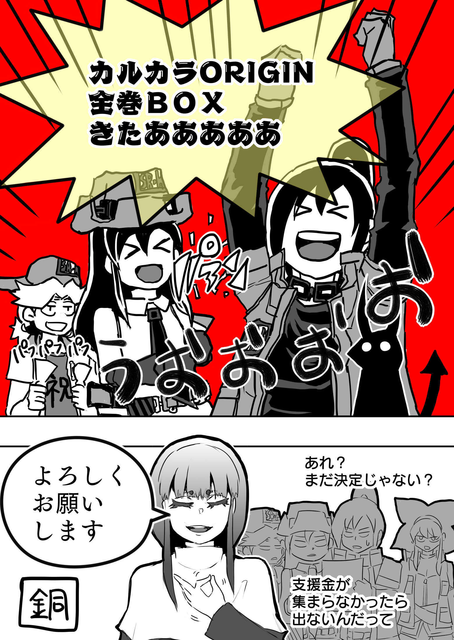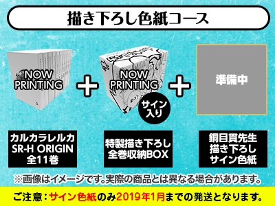 また、「描き下ろし全巻収納BOXコース」が、この短期間で売切れとなり、正直1つでもお求めいただければ十分ありがたいですよね…、と話を進めていただけに大変驚いております。お陰様で売切れとなりました本コースにつきまして、銅先生ならびに担当編集と協議した結果、3つ追加することにいたしました。(銅先生、誠にありがとうございます…!)ただし、追加版は、色紙&収納BOXの納品日を2019年5月まで、とさせていただきます。