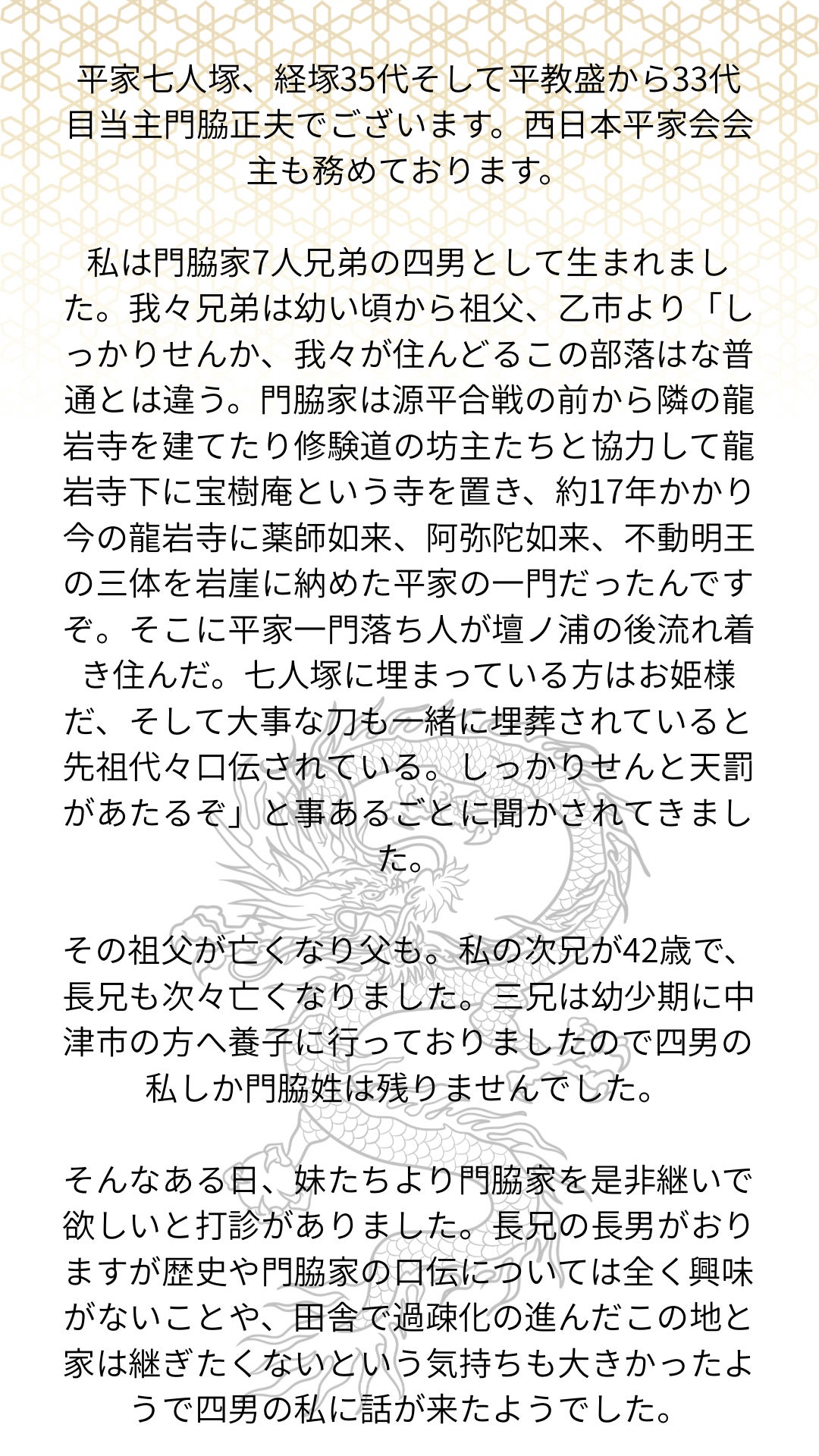 このプロジェクトは、平教盛公の子孫である門脇正夫が中心となり、大分県宇佐市にある「平家七人塚」を守り続けてきた一族と共に実行されます。
