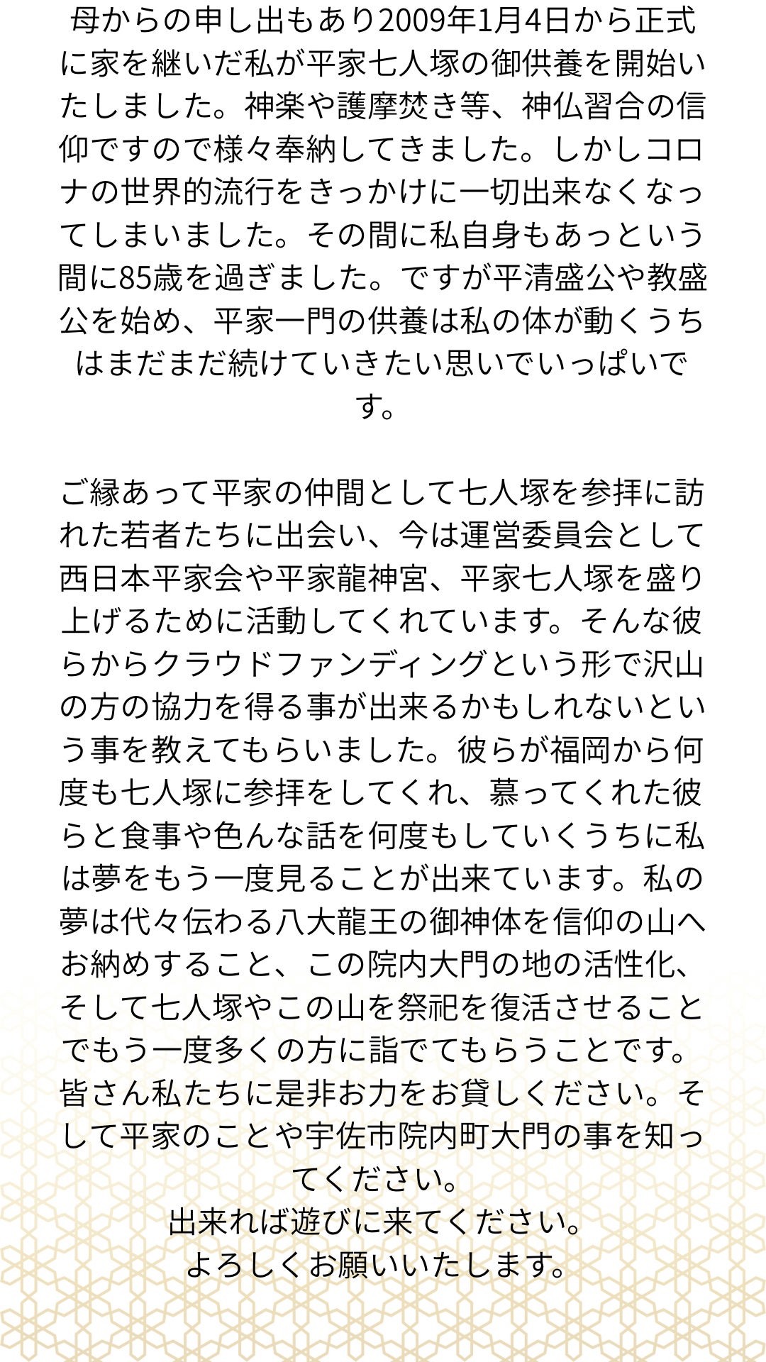 「平家七人塚」は、単なる歴史的遺産ではなく、私たちの文化と心の拠り所です。このプロジェクトを通じて、私たちは平家の誇りを次世代へとつなげていきたいと考えています。