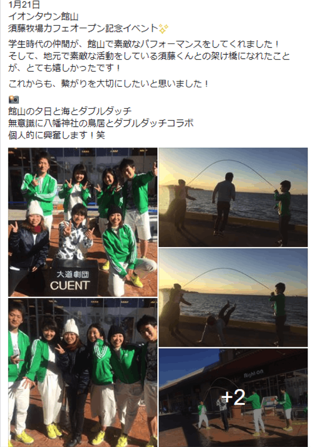 また私自身が千葉県ダブルダッチ協会に所属し、千葉県ダブルダッチ協会南房総支部を設立致しました。「ダブルダッチ」というスポーツを通して南房総を盛り上げる活動に着手しはじめているため、その活動とのコラボも行っていけたらと考えております。