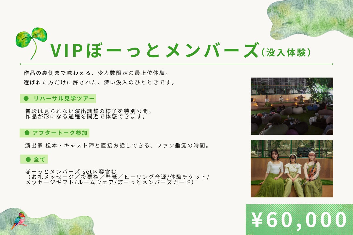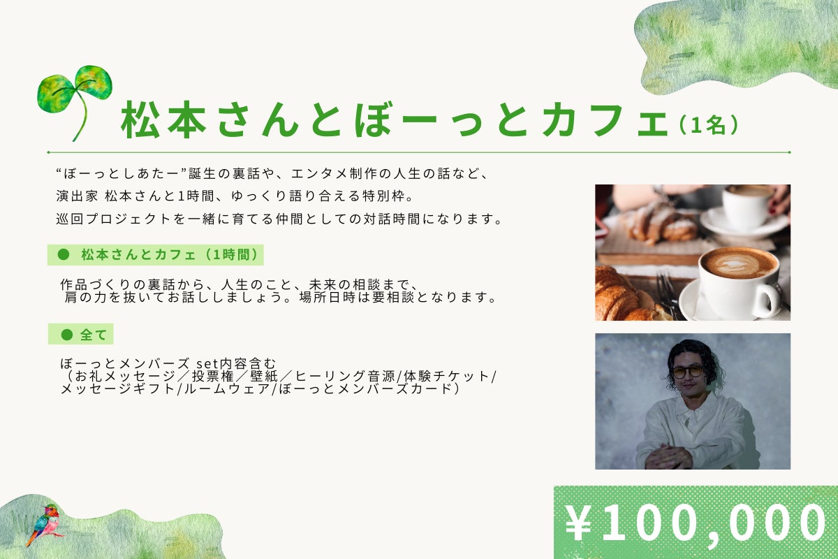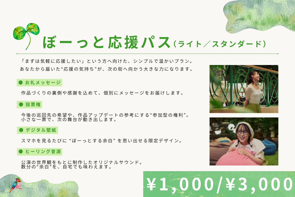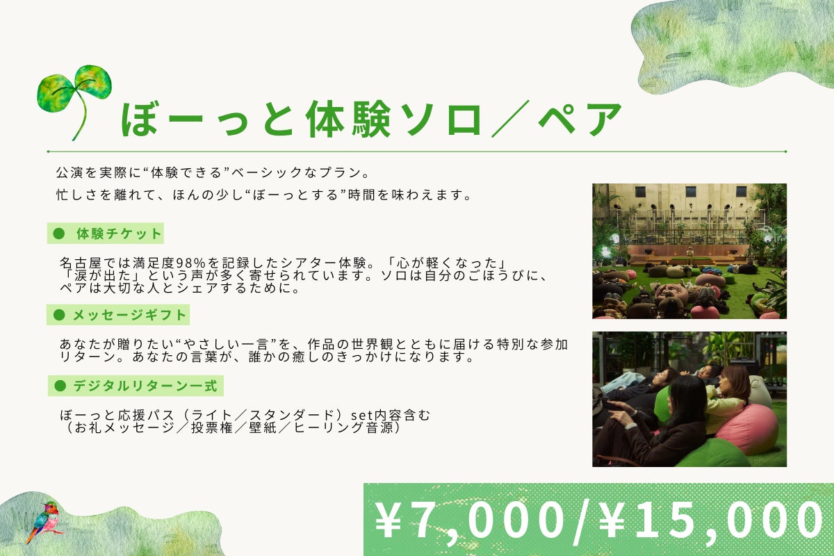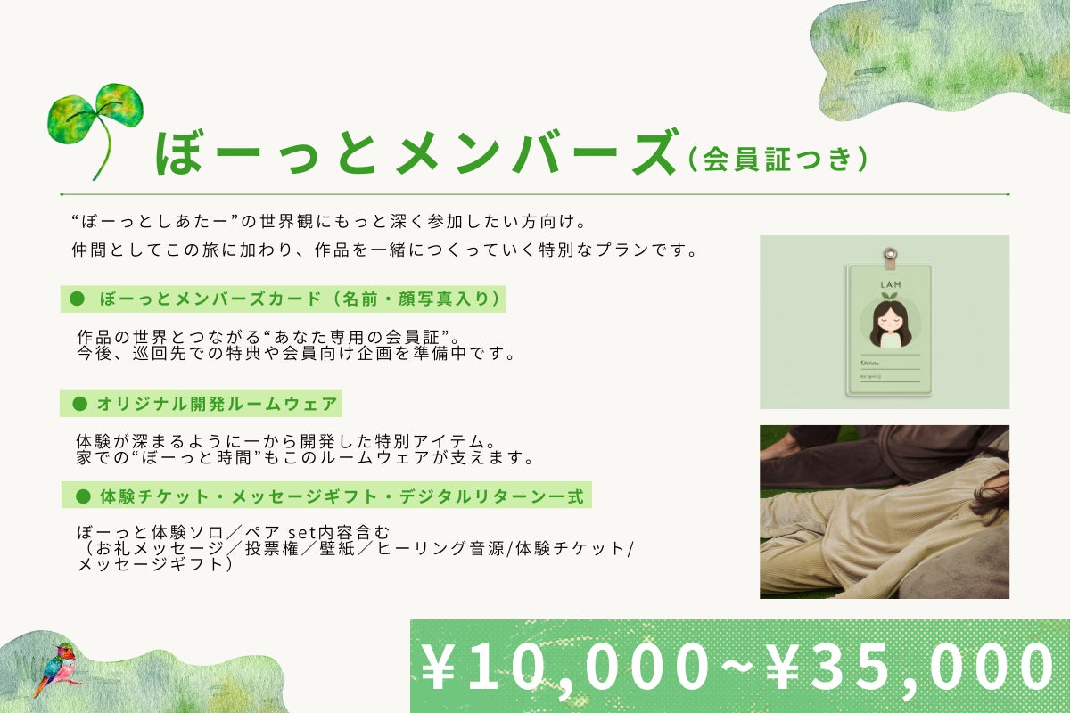 2026/01/05 10:20ご支援・応援いただいている皆さま、そしてページをご覧いただいている皆さまへ。ボ〜っとしあたーの全国巡回プロジェクトについて、現時点での 開催予定地と時期 を共有させていただきます。■ 現在想定している開催エリアと時期・大阪|2026年3月上旬ごろ・福岡|2026年4〜5月ごろ・名古屋|2026年6〜7月ごろ・東京|2026年10〜12月ごろ※いずれも現時点での想定であり、会場や詳細日程は現在調整中です。本プロジェクトは、名古屋でのトライアル公演を起点に、各地の空間や空気に合わせて少しずつ形を変えながら巡っていく構想で進めています。そのため、すべてを最初から確定させるのではなく、現実的な進行状況に合わせて一つずつ丁寧に決めていく方針を取っています。■ クラウドファンディングが達成した場合について今回のクラウドファンディングが目標金額に達成した場合、上記の開催計画を より確実に実現するための準備 を進めていきます。具体的には、 各地での会場確保・空間演出の強化 キャスト・スタッフ体制の安定化 無理のないスケジュールでの巡回実施 などを想定しています。支援金は、この「全国を巡る体験を、きちんと続けていくための土台」として大切に使わせていただきます。今後、開催地や日程が正式に決まり次第、こちらの活動報告やSNSにて随時お知らせしていきます。引き続き、ボ〜っとしあたーの挑戦をあたたかく見守っていただけたら嬉しいです。どうぞよろしくお願いいたします。 もっと見る