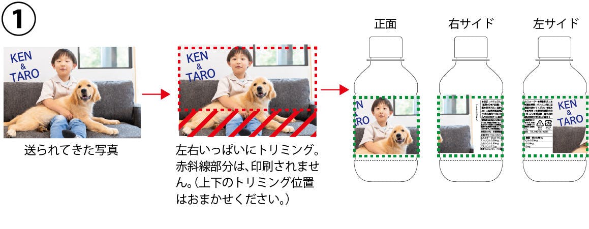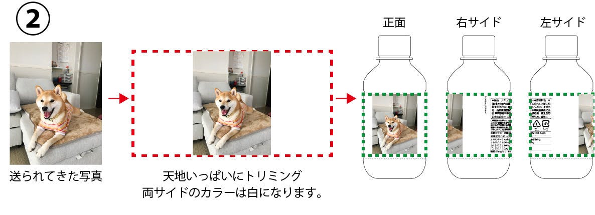 下図の赤点線枠が使用できる画像サイズの目安、緑点線枠がボトル幅の目安となります。ペットや人物のお顔など、写真の中で特に見せたい部分を緑点線枠内に収めていただくと、バランスよく仕上がります。