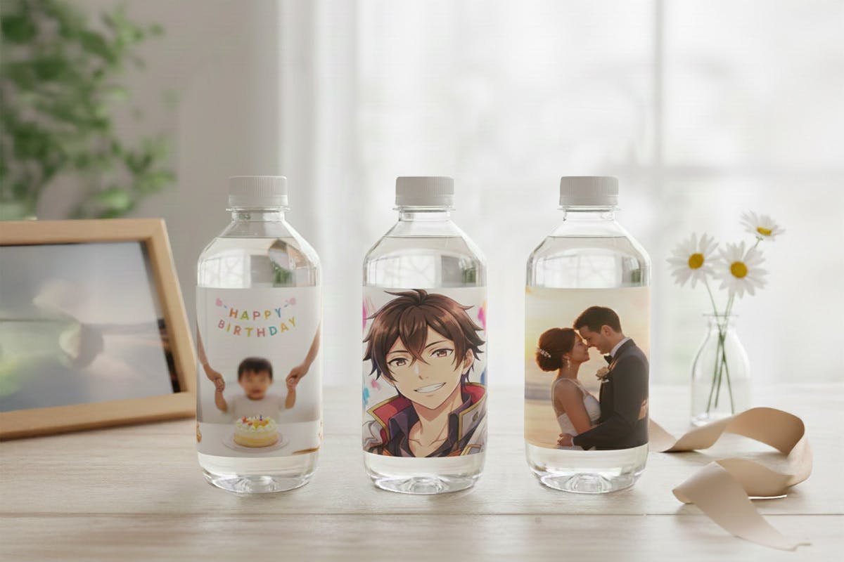 オリジナルのイラストや写真(JPEG / PNG形式)をお送りいただき、その画像をもとにオリジナルラベルを制作いたします。ラベルは横に長い長方形サイズで、ボトル全体にぐるりと巻く仕様です。