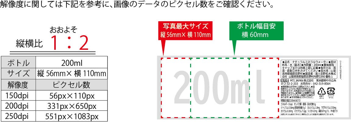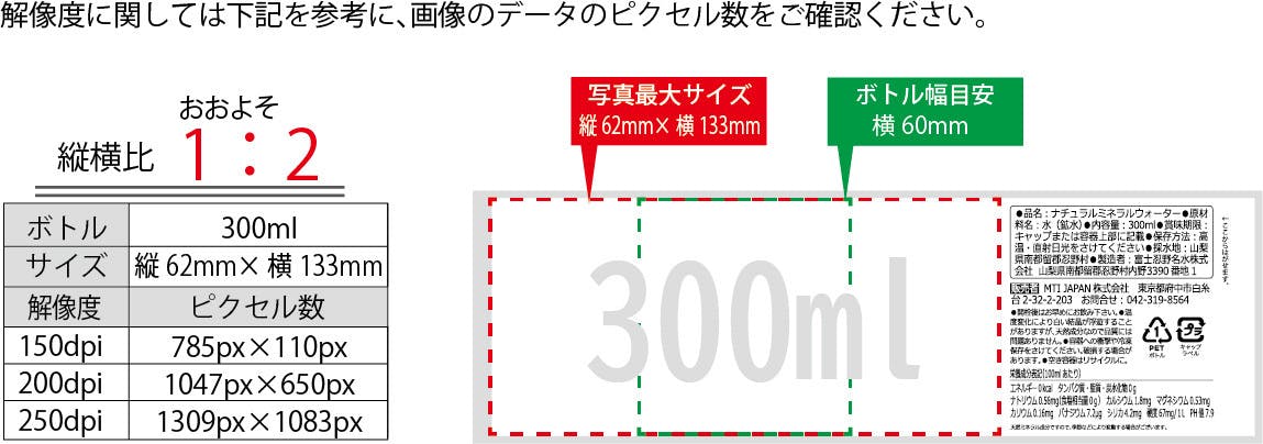 下図の赤点線枠が使用できる画像サイズの目安、緑点線枠がボトル幅の目安となります。ペットや人物のお顔など、写真の中で特に見せたい部分を緑点線枠内に収めていただくと、バランスよく仕上がります。