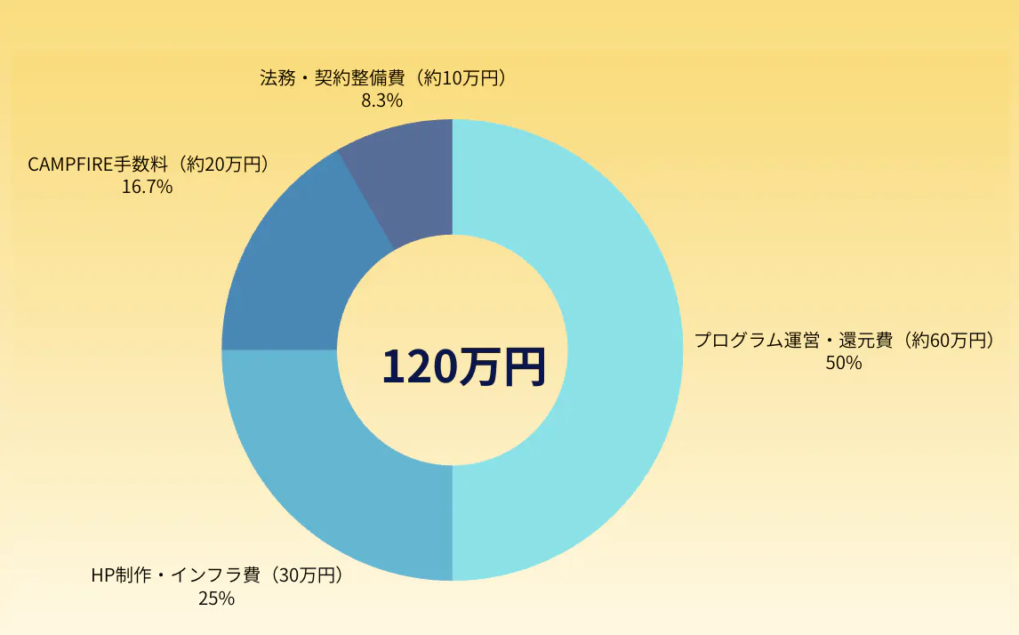 本プロジェクトの目標金額は120万円です。ご支援いただいた大切な資金は、プロジェクトの透明性を確保し、持続可能な運営基盤を築くために、以下の通り大切に使用させていただきます。
