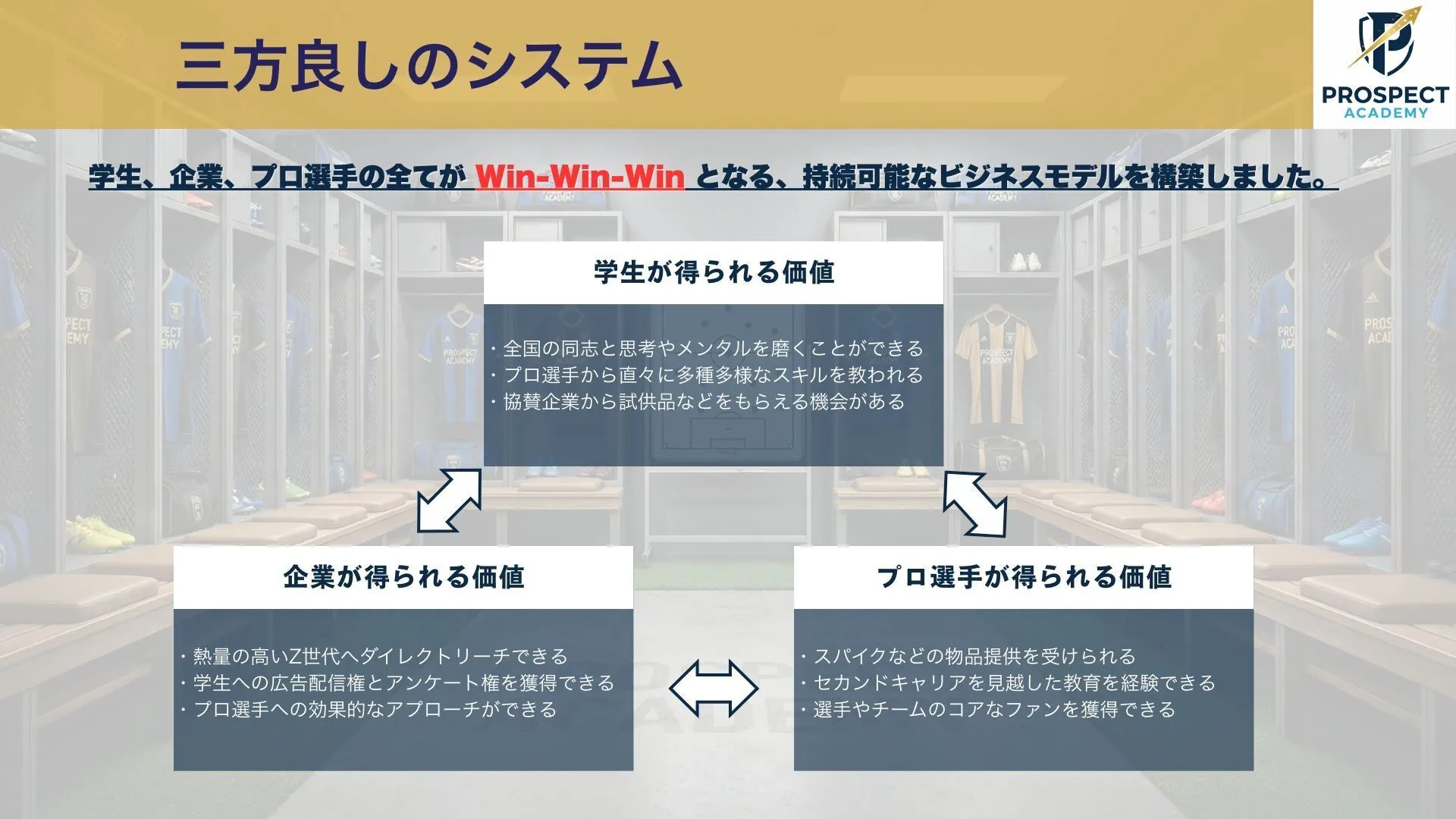 ロッカールームが試合前の意思統一や試合後の振り返りを行う、チームの魂が集まる場所であるように、未来ある学生たちが経済的な心配なく、自己研鑽に励めるよう、私は情熱をもって、このPROSPECT ACADEMYという最高の環境を準備していきます。