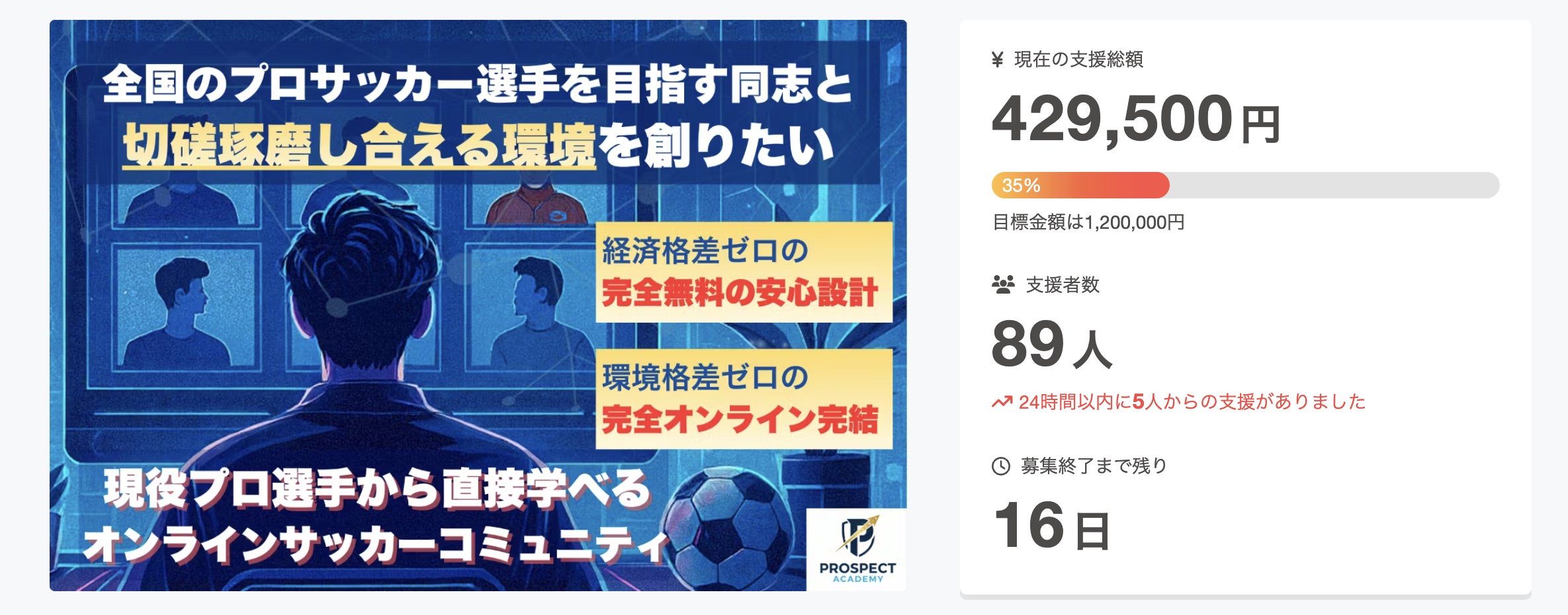 残り6日となり、現在のご支援総額は528,000円で、支援者数は98名となりました。これまでご支援いただいた98名の皆様、本当にありがとうございます!毎度言ってはいますが、諦めずにもがき続けます!!本日は「学生の頃の私は」というテーマで書いていこうと思います。今は26歳となり、プロを目指すサッカー人生ではなく、プロを目指す学生を応援する立場になりました。そんな私が学生だった小・中・高・大学生だった頃、どんな学生だったのか。紛れもなく事実なのは、「プロを目指していた」ということ。まずは小学生福島県伊達市の田舎町で生まれ、本格的には小学2年生から地元の少年団に入ってサッカー人生をスタートさせました。正直その頃はうまかったと思います。割と思うように体を動かすことができるタイプで、運動神経だけで点をとるFWからゴールを守るGKまで卒なくこなすオールラウンドプレーヤーでした。田舎の中ではもちろんどんな試合でも活躍できている感覚はあり、「俺に任せろ」と試合中もよく言っていた少し恥ずかしい記憶もあります。中学生ベガルタ仙台に合格をきっかけに親元を離れ、祖母と二人で宮城県へ移住しました。チームでの活動初日の感想は、「無理だ」以外何も出てこなかったです。福島の田舎で活躍していると勘違いしていた一人の少年が、東北で一番レベルの高いチームに受かってしまったことで、伸びきっている鼻は完全に折られました。それからの3年間は、試合に出たり出なかったり。同期のライバルが、中学3年生で難関校への受験に切り替えるため退団したことで、自動昇格のようにユースへ。高校「同期がいなくなったからだ」という多少、いやかなり多めなネガティブを心に潜ませながら活動初日を迎えたことを覚えています。ただ、高校1年の間は国体選抜に選ばれ、実際に宮城県国体を全国出場に導いたりと順風満帆なサッカー人生とも言えた気がします。しかし高校1年から2年生に上がるタイミングで慢性的な疲労から腰の大怪我でチームから1年半の離脱を強いられます。復帰したのは3年の夏で、プロになるには、いい大学にいくには何よりも大事な全国大会は、現在アビスパ福岡でゴールキーパーとして活躍する小畑裕馬にスタメンを預け、ベンチ外。3年時はキャプテンであったのにも関わらず情けない想いでした。この頃です、完全に「プロ」を諦めたのは。もちろん怪我だけではなく、GKにしては低い178cmの身長も、言うまでもなく技術も、全て。ここで完全に自分に負けました。大学私はご縁あって城西国際大学という千葉県の大学へスポーツ推薦で進学することができました。人生での転機は大学と言っていいでしょう。プロになる人間のレベルを間近でたくさん体感し、本格的に諦め、「起業」という道に走りました。原動力は「プロになったあいつより稼ぐ」。これ一心でビジネスの世界へ足を踏み入れました。これまで綴ってきたのは思い出ではなく、ただの時系列順の出来事です。共通して伝えたかったのは、「弱かった」ということなんです。レベルの高い環境に気持ちで負けました。ユース昇格というポジティブすらネガティブに捉えてしまう弱さに負けました。怪我に負けました。「あいつより稼ぐ」という他人軸での生き方で、向き合うべき自分に負けました。ここまで自分の隠したい過去を全て曝け出す理由はただ一つで、こんな自分のような人間が必ずいるはずと思うからです。チームスポーツをやっているはずなのになぜか個人戦を凝り広げ、勝手に何かと比べて負け続けている学生が必ずいると思うからです。私はそんな学生の潜在的、うちに秘めている良さを引き出せるような環境を作っていきたいと思います。いつしか学生の頃、俺より下手だったやつが今プロで活躍しています。いつしか学生の頃、日本で知らない奴はいないほどうまかったあいつは今、プロになれず普通に働いています。どんな人が、果たしていつ花開いていくかなんてわからないんです。私はプロになれなかったけど、私にしかできない形で後輩たちの「プロになる」という夢を応援していきます。長くまとまりのない文だったと思います。最後まで読んでいただきありがとうございました。PROSPECT ACADEMY 代表 伊藤