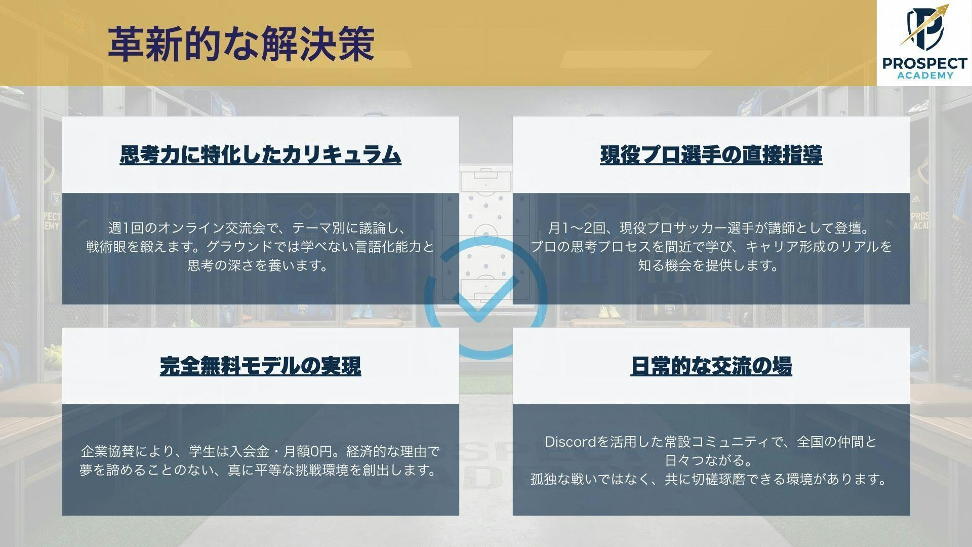 ロッカールームが試合前の意思統一や試合後の振り返りを行う、チームの魂が集まる場所であるように、未来ある学生たちが経済的な心配なく、自己研鑽に励めるよう、私は情熱をもって、このPROSPECT ACADEMYという最高の環境を準備していきます。