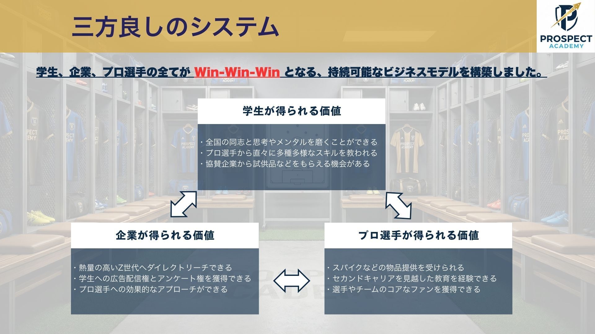 ロッカールームが試合前の意思統一や試合後の振り返りを行う、チームの魂が集まる場所であるように、未来ある学生たちが経済的な心配なく、自己研鑽に励めるよう、私は情熱をもって、このPROSPECT ACADEMYという最高の環境を準備していきます。