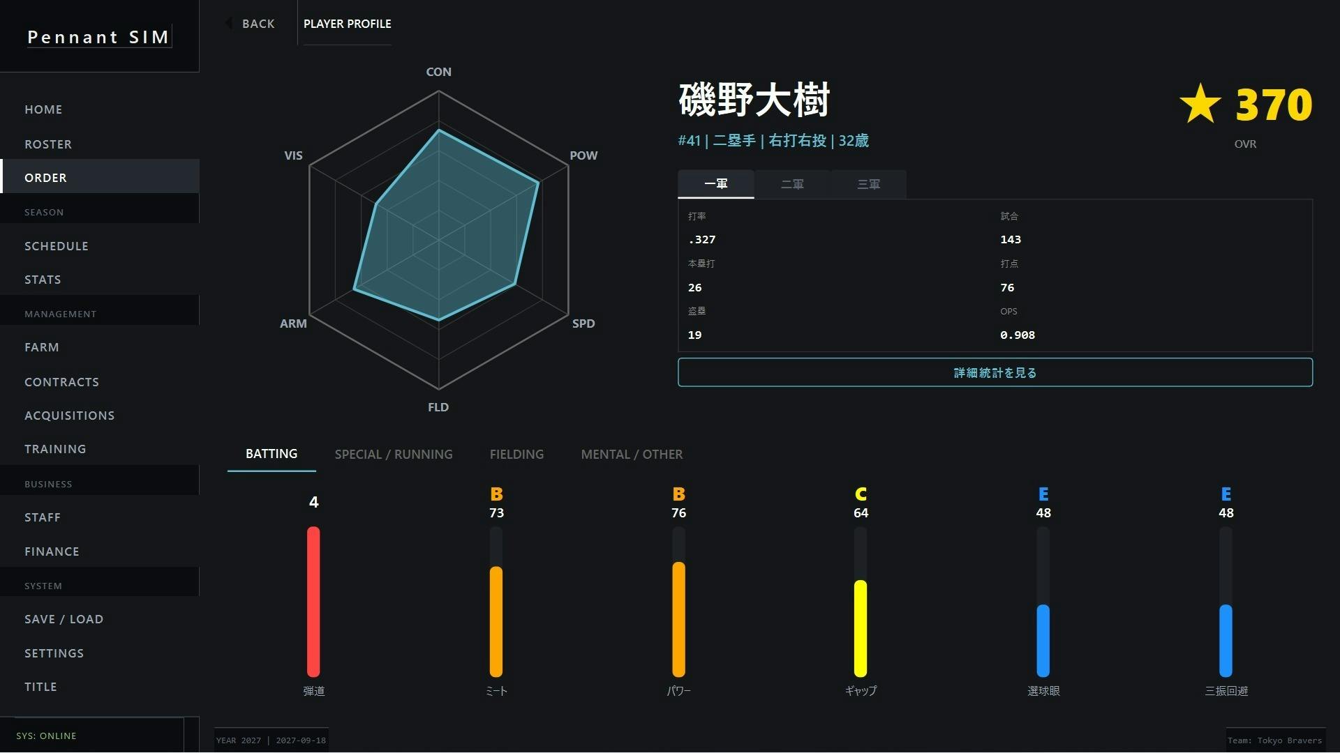 ・詳細な試合シミュレーション、セイバーメトリクス指標を含む詳細な成績記録システム。