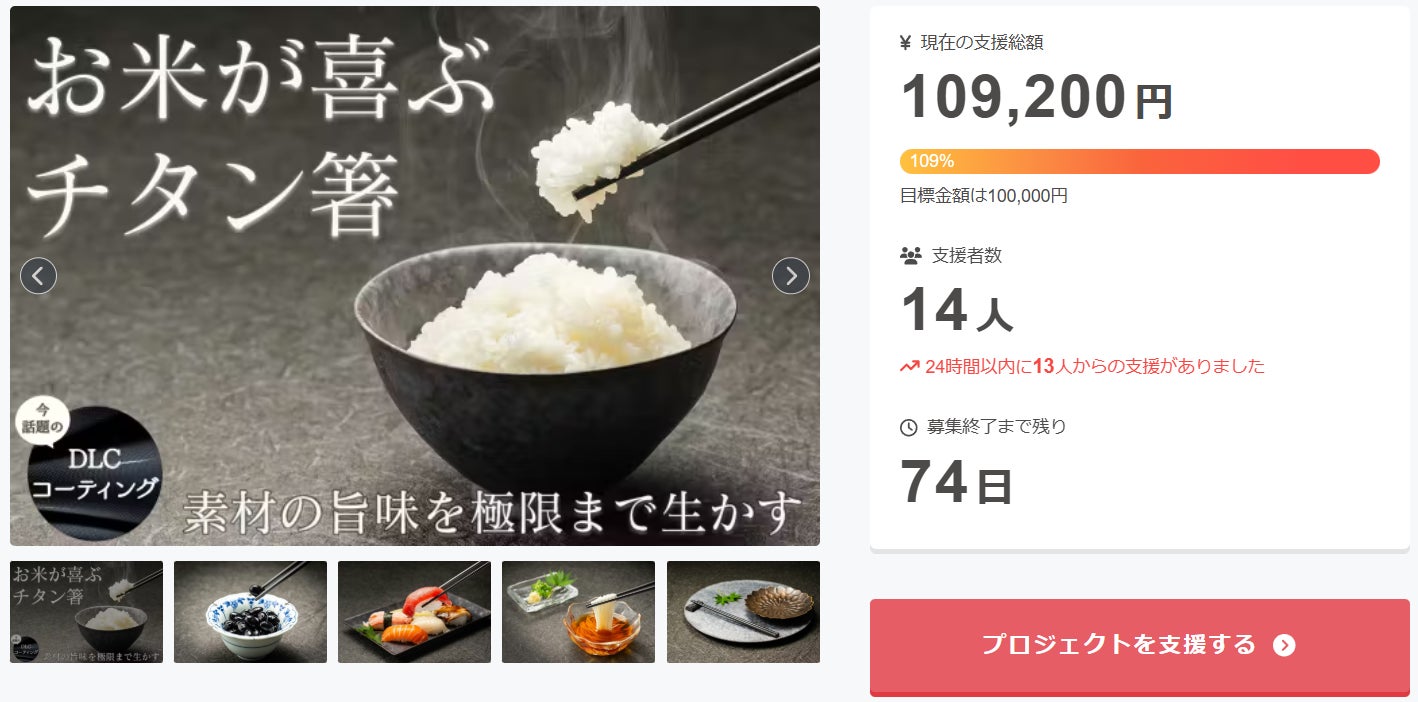 サポーターの皆様ご支援ありがとうございます!本日10時からデビューさせて頂きました純チタンカーボンコートCLIL箸ですが、開始早々短時間で目標を達成することができました!これもサポータの皆様のお陰です。本当にありがとうございました!!まだまだ始まったばかりですがこれからも応援の程、宜しくお願い致します。