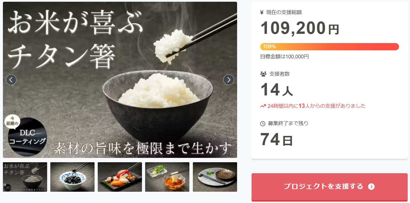 2025/12/30 10:18サポーターの皆様ご支援ありがとうございます!本日10時からデビューさせて頂きました純チタンカーボンコートCLIL箸ですが、開始早々短時間で目標を達成することができました!これもサポータの皆様のお陰です。本当にありがとうございました!!まだまだ始まったばかりですがこれからも応援の程、宜しくお願い致します。 もっと見る