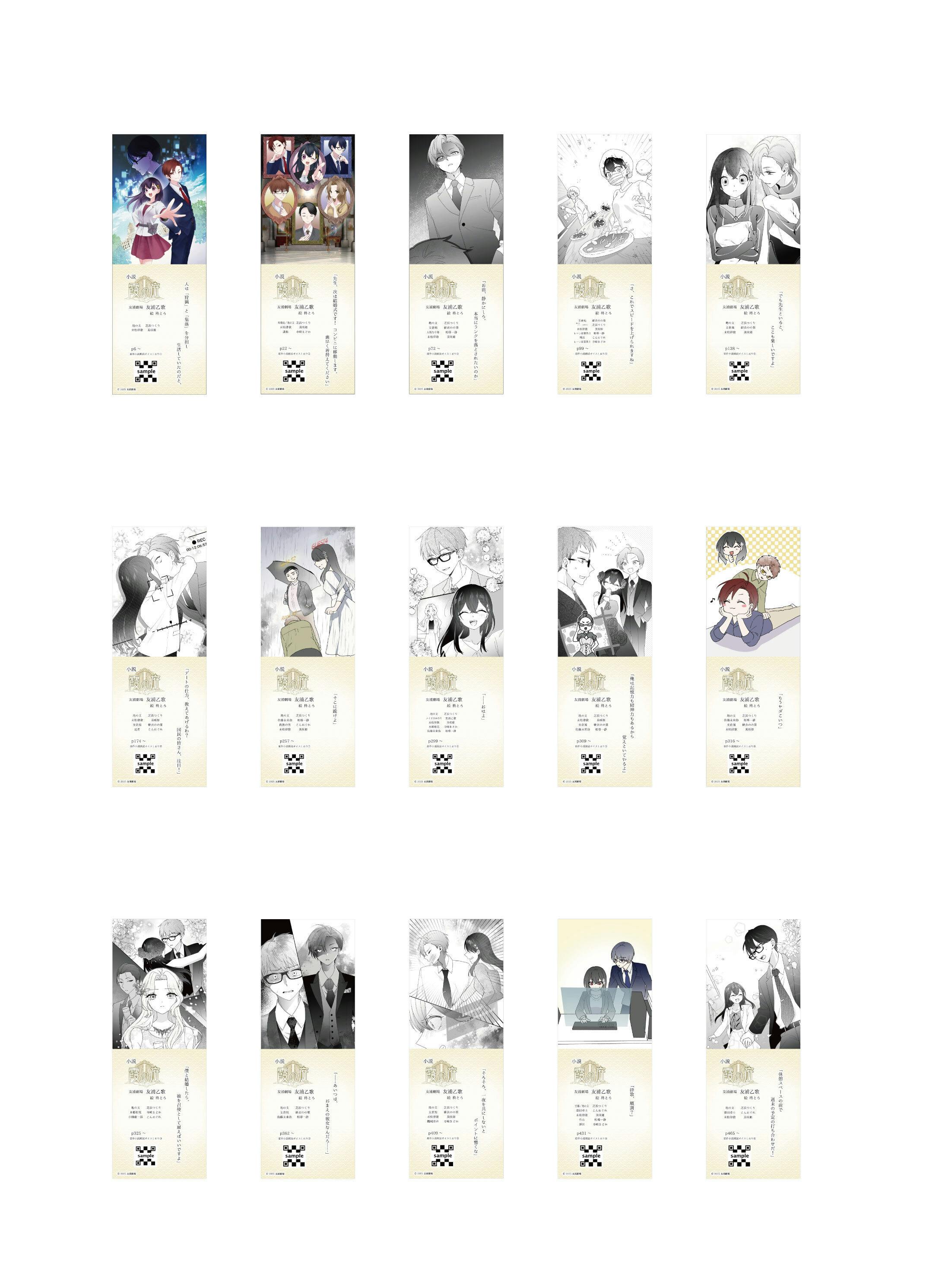QRコードを読み取ると、小説の一部をキャストが朗読したボイスが聴けます。(各キャラクターを各役者が演じます。)このしおりで小説を読みながら聴こう!