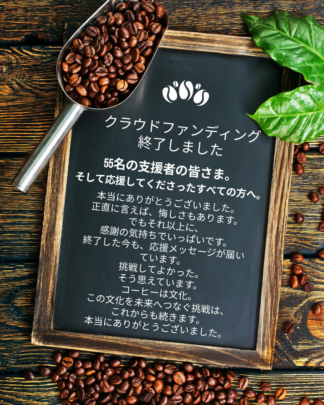 2026/03/01 13:20クラウドファンディングが終了しました。55名の皆さまから、374,000円のご支援をいただきました。目標には届きませんでしたが、この挑戦を通して、どれだけ多くの方に支えられているかを実感しました。終了した今も、応援メッセージが届いています。本当に、感謝の気持ちでいっぱいです。正直に言えば、もっと早く動けたのではないかという思いもあります。でもそれ以上に、ためらわず支援してくださった皆さまの存在が、私にとって大きな財産です。コーヒーは嗜好品ではなく、文化。この文化を未来へつなぐ挑戦は、これからも続きます。改めて、本当にありがとうございました。「次の一歩については、改めてご報告いたします。」 もっと見る