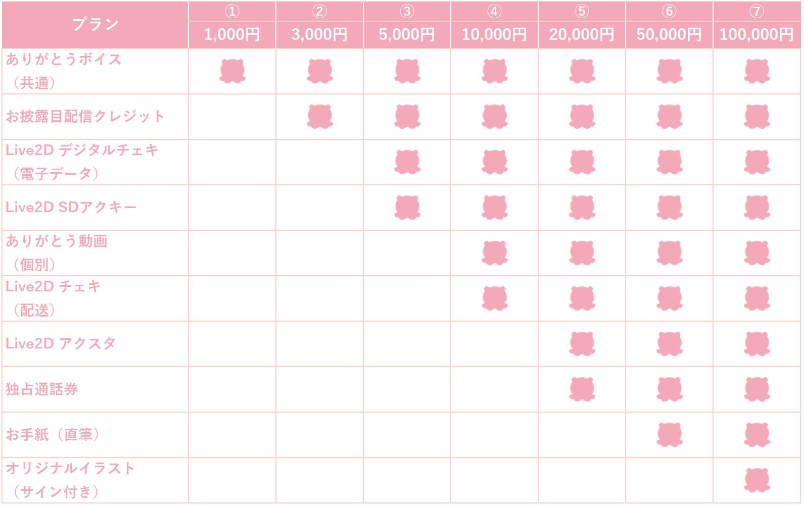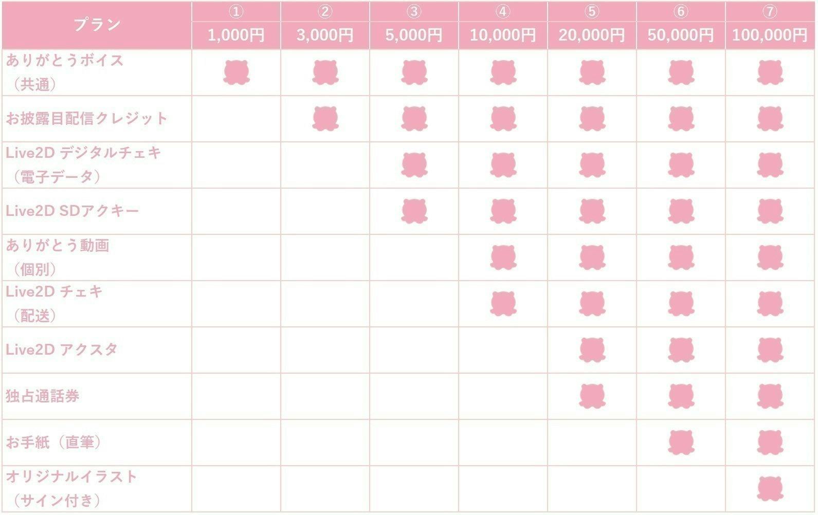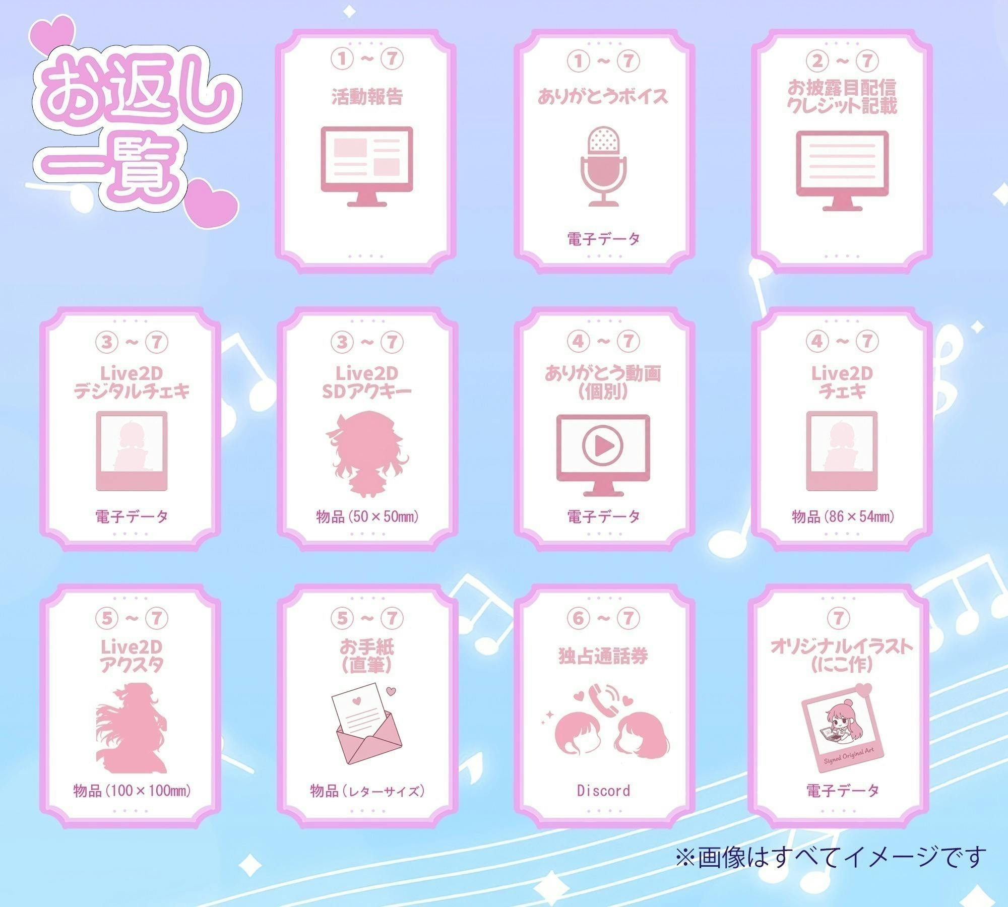 支援してくださる皆様には、「ありがとう」の気持ちを込めた様々なリターンをご用意しています。ありがとうボイスから始まり、デビュー配信でのクレジット表記、お礼イラストアイコンなど、段階的にご用意いたします。高額支援者の方には、お手紙や、オリジナルイラストの提供なども予定しています。