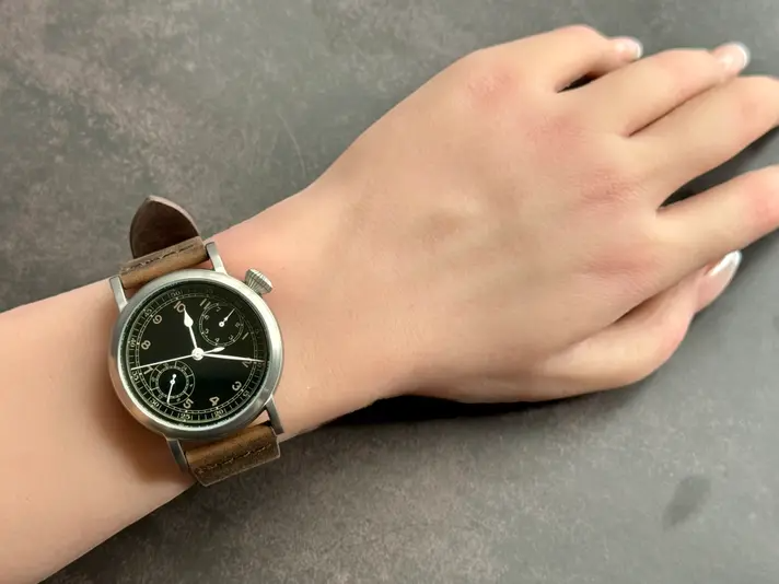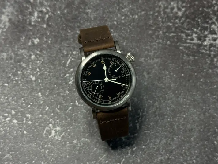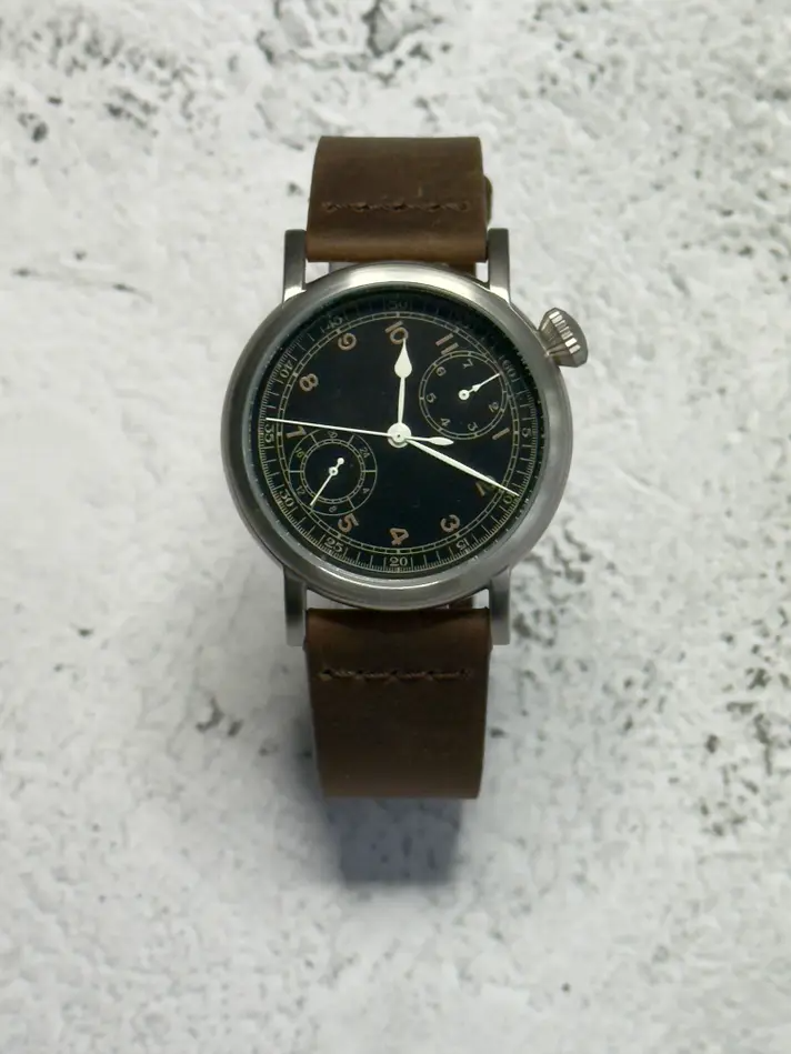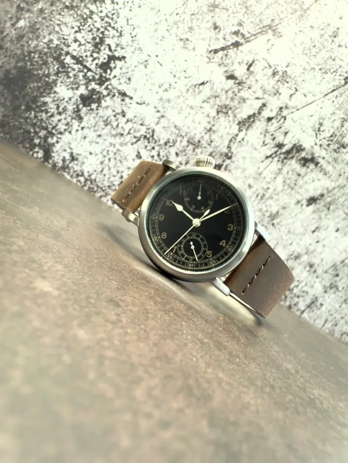 タイプ A-7 アヴィエーションハックウォッチ は、1930 年代にロンジンとメイランが製造し、米国陸軍航空隊USAAF(United States Army Air Forces)に配給されたパイロットウォッチに基づいています。ミリタリーウォッチの教科書とも言える本の表紙にも使われているマニア憧れのモデルです。