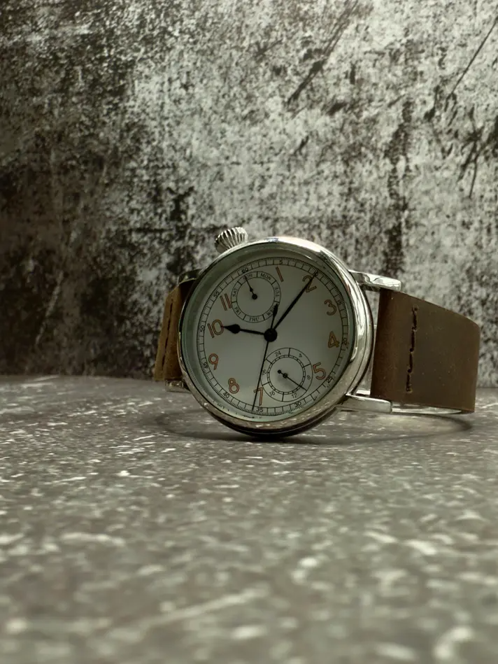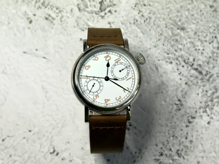 前記にある通りオリジナルケースは49mm〜51mmととても大きいです。文字盤のデザインのイメージを出来るだけ崩さず、38.5mmに入れ込むのはとても大変な作業でありました。また機能を24時間と曜日表記に変更し、オリジナルの雰囲気を維持するにはトライアンドエラーの連続でした。