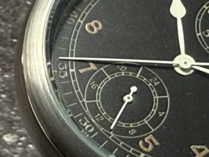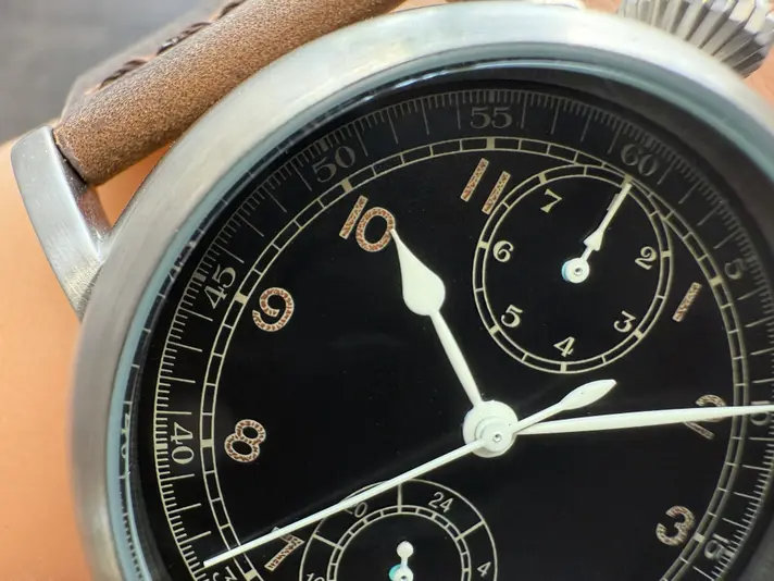オリジナルノTYPE A-7が1834年10月に調達された時点ではホワイト文字盤でした。1940年にミルスペックに則り、以降はブラック文字盤になりました。スイスに実在したAR&J.E.MEYLAN社の文字盤をオマージュしています。6時位置には24時間時計を配しました。