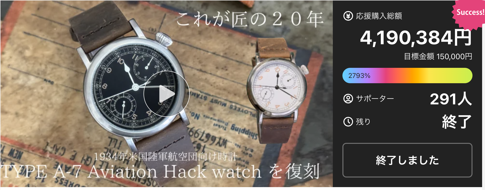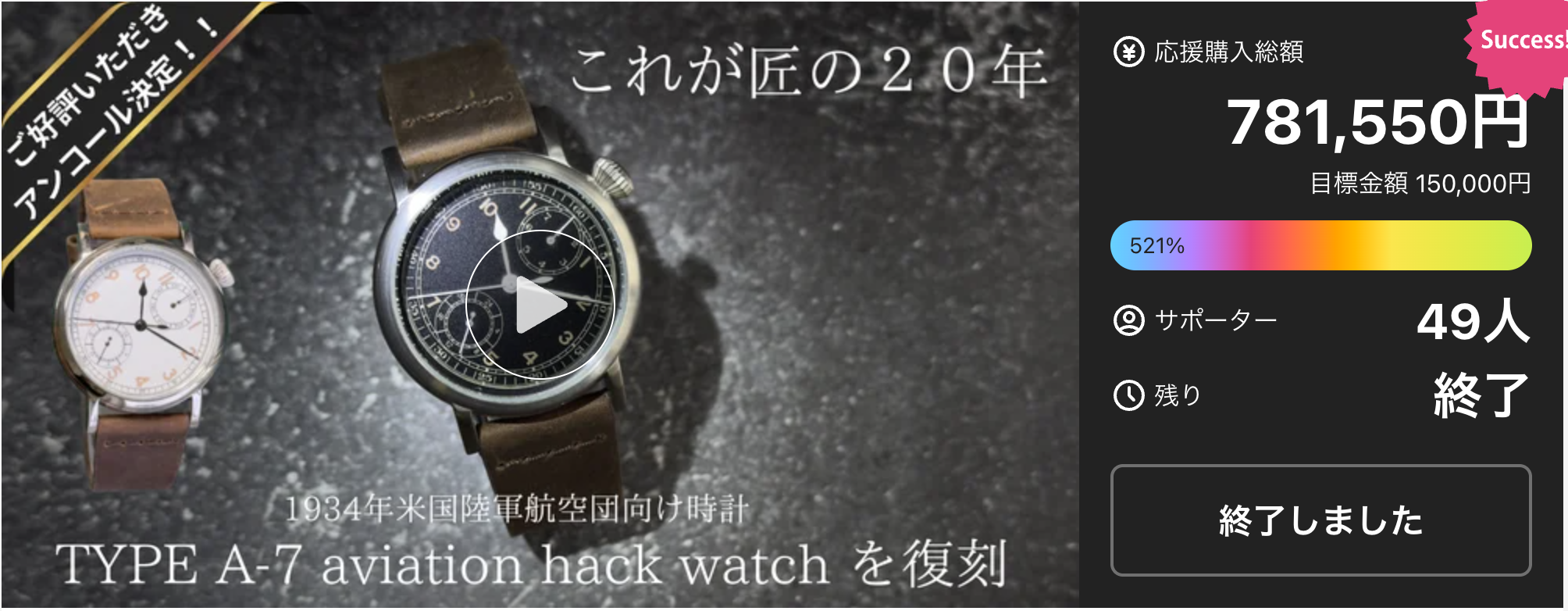 2026/03/09 12:00ご支援いただき誠にありがとうございました。先週末より出荷を始め全ての出荷を完了いたしました。クリックポストでの配送ですので、郵便受けに納品となります。今後も世界中の名作ミリタリーウォッチを紹介していきたいと思います。現在もCAMPFIRE様にて「トレンチ・ドライバーズウォッチ」を20周年記念価格にて販売しておりますが、あいにく全く売れておりません。すでに制作を終えていてすぐに納品できる商品であります。また、こだわり過ぎている所もございますがとてもいかっこいい時計だと自負しています。一度サイトをみていただければ幸甚です。https://camp-fire.jp/projects/836977今後とも何卒よろしくお願いもうしあげます。 もっと見る