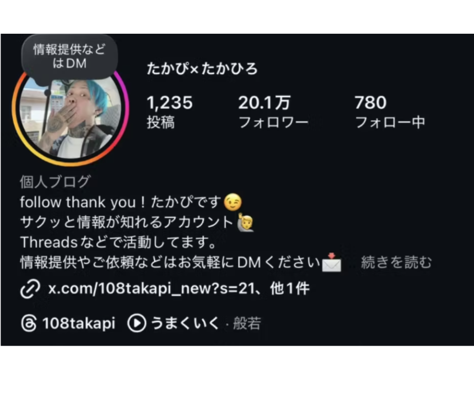Threads https://www.threads.com/@108takapi?igshid=NTc4MTIwNjQ2YQ