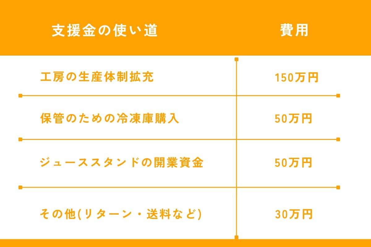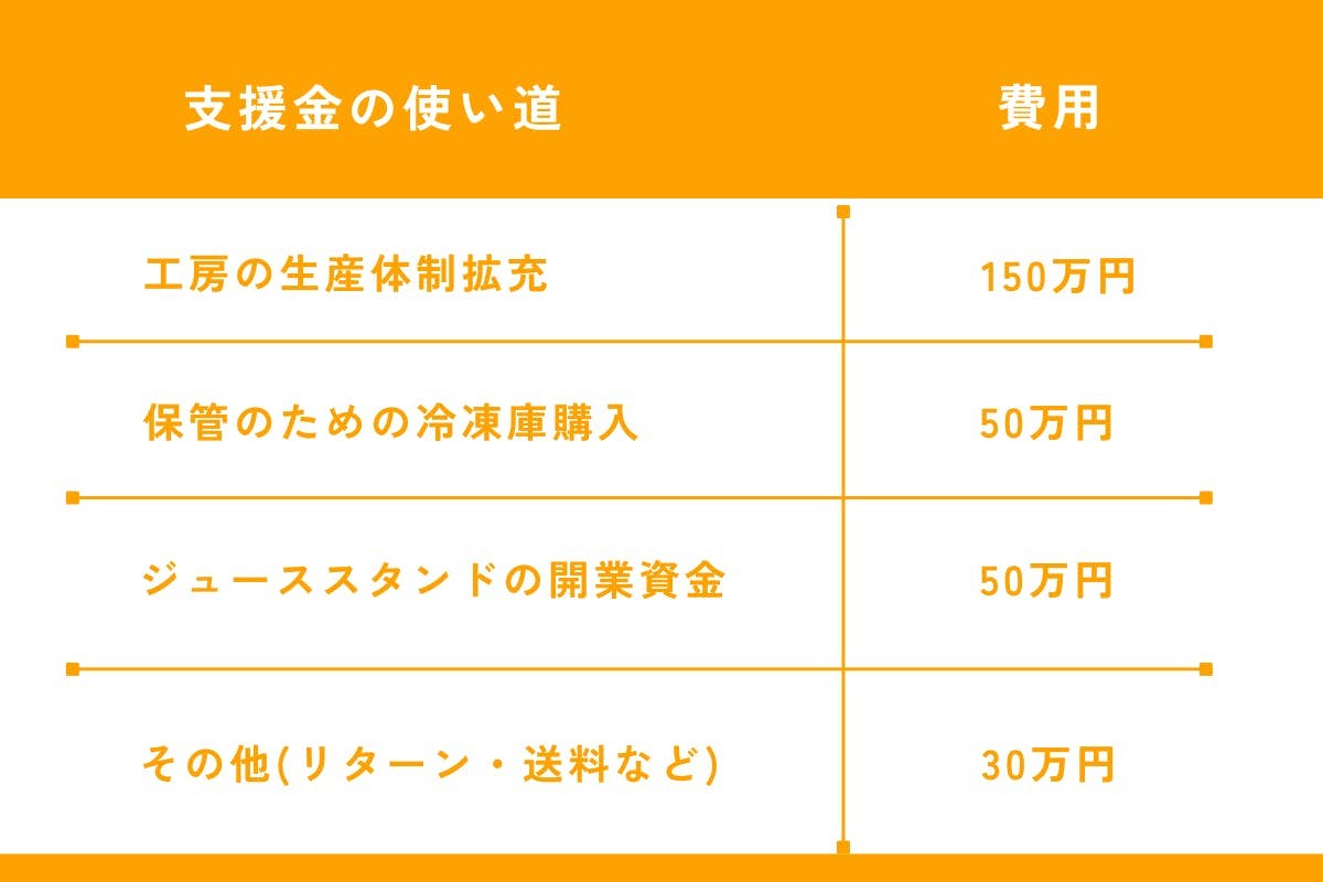 今回皆様からいただいたご支援は、工房への設備増設の資金として、活用させて頂きます。現在は小さい機械での少量の生産となっています。これからより多くのジュースを製造していくために機材の購入を行う予定です。