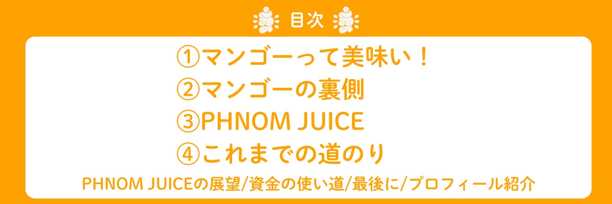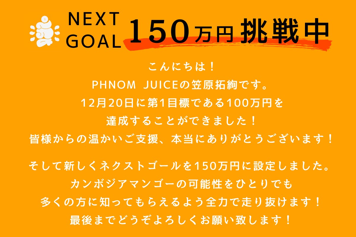 そして、カンボジアのマンゴーって美味しいんだって世界中の方に知ってもらって、この国のマンゴーにプライドと誇りを持って欲しいです。僕はまだまだ未熟で失敗もたくさんするかもしれません。それでも諦めず、PHNOM JUICEをまず日本に届けれるよう頑張っていきますので、応援の程、何卒よろしくお願いします!