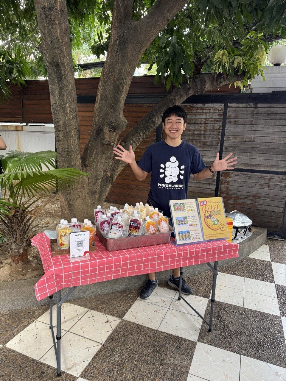 2026/01/14 19:21こんにちは!今回PHNOM JUICEは新年に新商品としてバナナを使ったフレッシュジュースの発売を開始しました!名前はBanana Coco(バナナ・ココ)バナナを主軸にココナッツやドラゴンフルーツをブレンドしたジュースになります。バナナをイメージするとバナナシェイクやスムージーなど、どろっとしたものを意識しがちですが、今回はさらっと飲みやすいさっぱりバナナに仕上げました。ライムを入れているので、後味が爽やかになります。バナナココは、カンボジアのバナナの品種「ジェイ・ポーモーアン」を使っています。バナナといってもカンボジアには多くの種類のバナナがあり、どんな品種があるのか勉強するところからスタートしました。このジェイ・ポーモーアンは小さい果実のバナナで、甘味が他のバナナより強い品種になります。熟成させて黒いシュガースポットができるとかなり甘くなります!今回はマンゴーではなく、バナナでの新商品。先日イベントがあり、初お披露目をしました!お客さんの反応は上々です!2月3月と新しい挑戦を続けていきます。引き続き何卒よろしくお願いします!! もっと見る