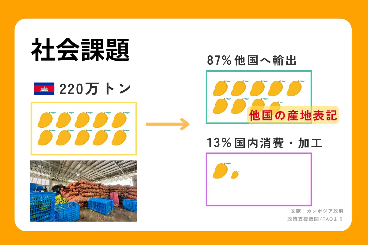 可能性あるものが安く買い叩かれ、他国へ異なる産地表記で流れていく現実。カンボジアのマンゴーであれば、Made in Cambodiaで世界へ発信していくべきだし、世界に誇れるマンゴーになれるはずなのに。
